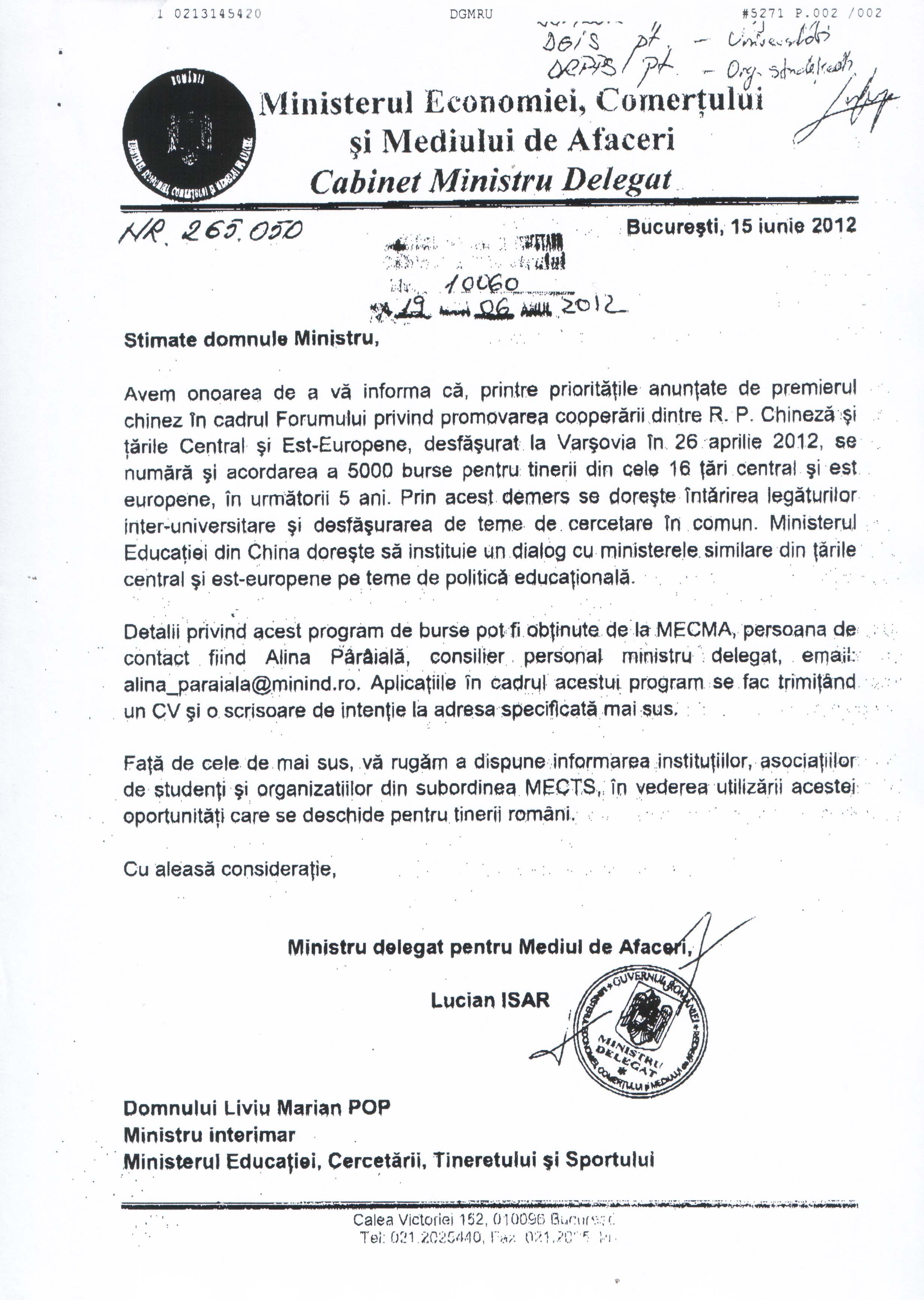 În ataşament aveţi adresa Ministerului Economiei, Comerţului şi Mediului de Afaceri, în care sunt prezentate informaţiile cu privire la acordarea de burse tinerilor, în următorii cinci ani.