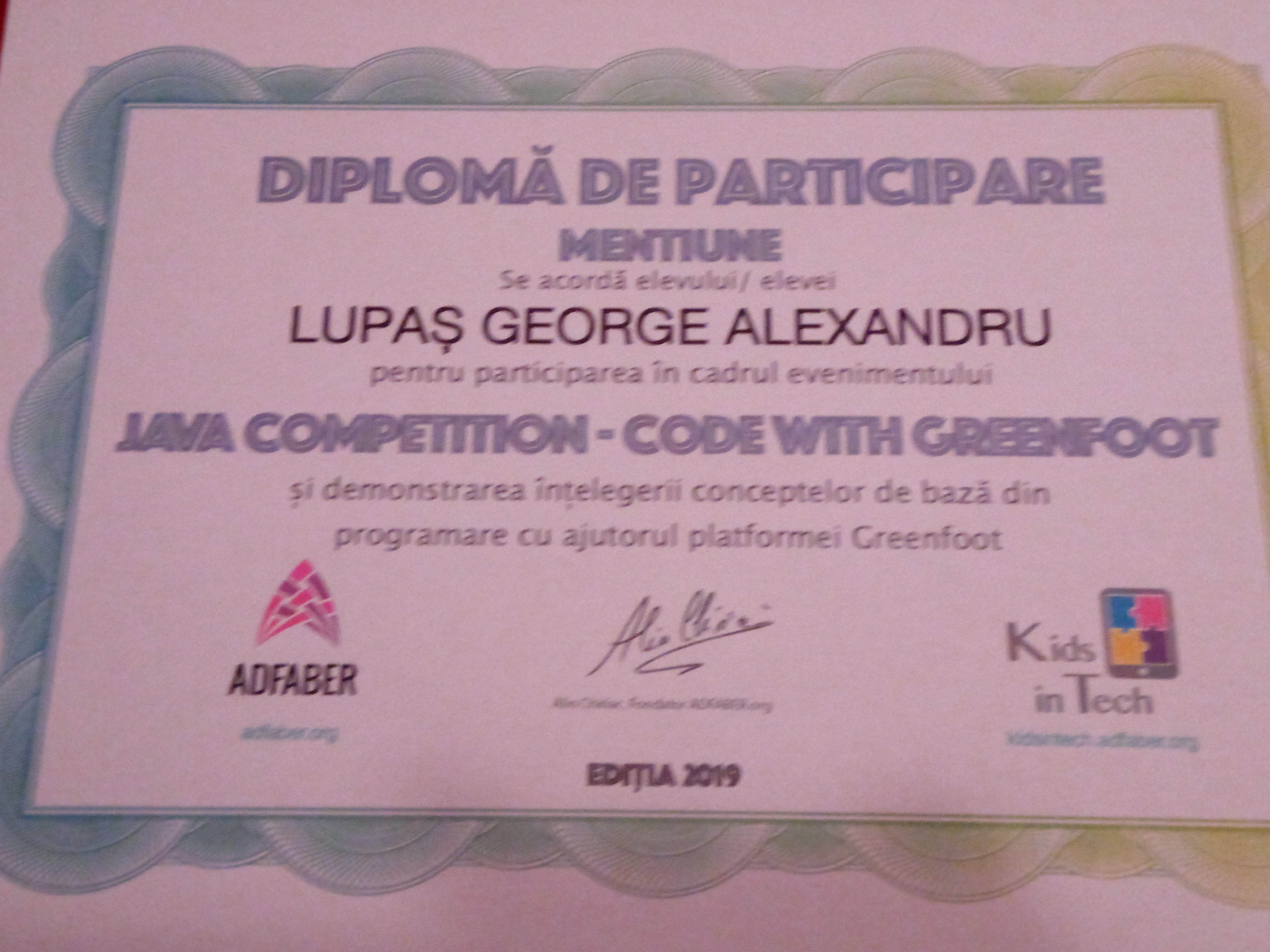 3. Elevii LUPAȘ GEORGE ALEXANDRU și HĂRDUȚ EMANUEL IOAN din clasa a Ix-a de la Liceul Teoretic ”Avram Iancu” Brad a obținut MENTIUNE la Concursul Național JAVA COMPETITION - CODE WITH GREENFOOT ( https://adfaber.org/2019/03/18/castigat ... foot-2019/ ).
