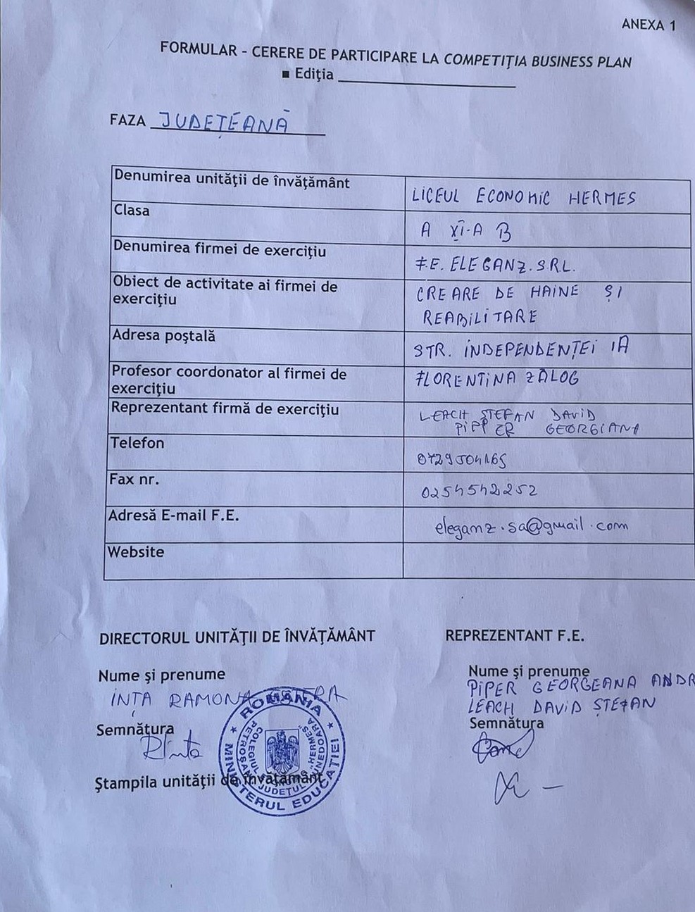 Pentru organizarea etapei județene, vă rugăm ca până la data de 6 martie să ne transmiteți lista firmelor de exercițiu înscrise la etapa județeană a Competiției Business Plan prin transmiterea Anexei 1 - Cerere de participare, semnată și ștampilată.