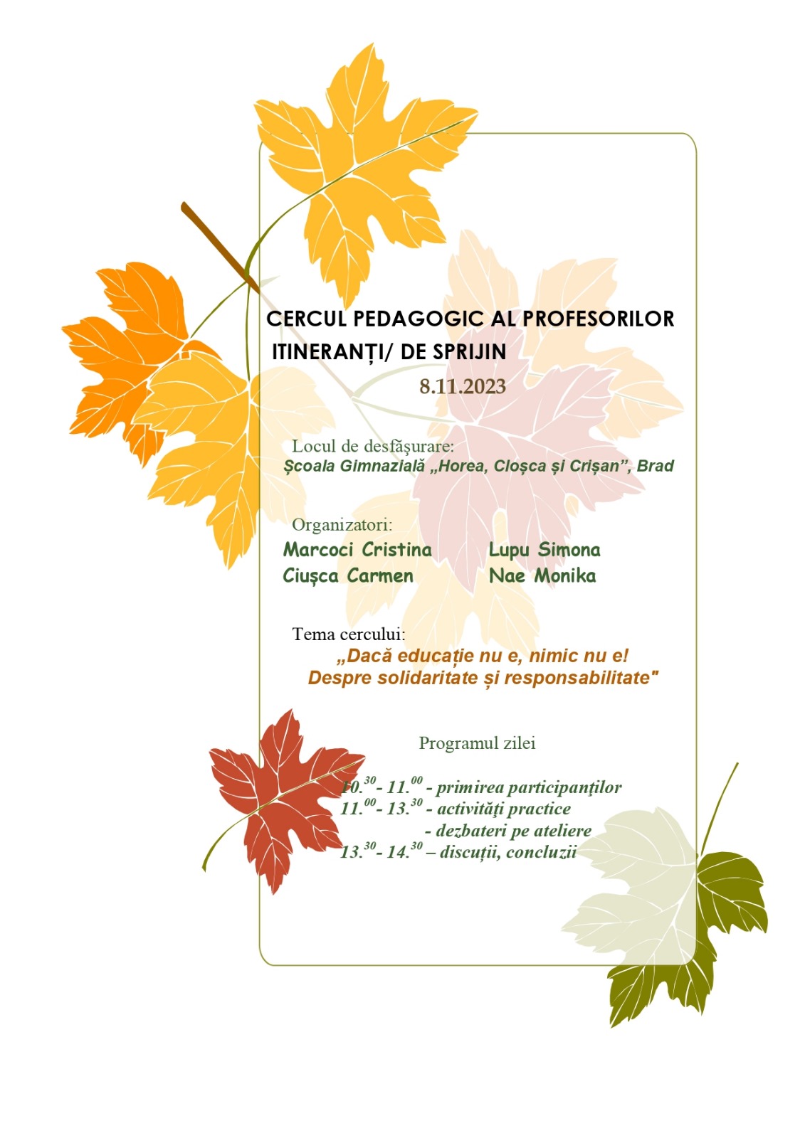 În data de 08.11.2023, cu începere de la ora 10.30, va avea loc prima activitate din cadrul Cercului pedagogic al profesorilor itineranți/de sprijin.