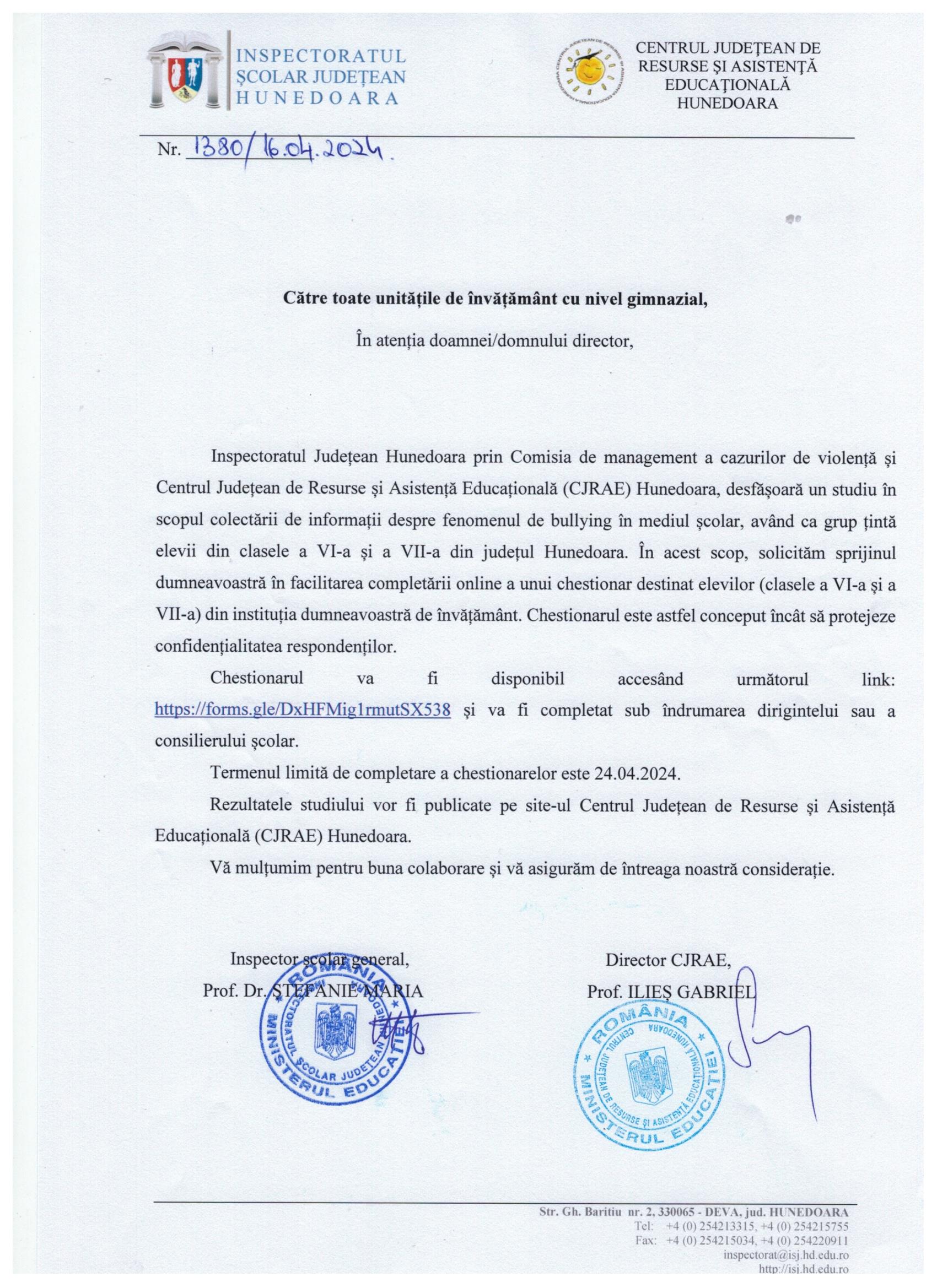 Inspectoratul Județean Hunedoara prin Comisia de management a cazurilor de violență și Centrul Județean de Resurse și Asistență Educațională (CJRAE) Hunedoara, desfășoară un studiu în scopul colectării de informații despre fenomenul de bullying în mediul școlar, având ca grup țintă elevii din clasele a VI-a și a VII-a din județul Hunedoara. În acest scop, solicităm sprijinul dumneavoastră în facilitarea completării online a unui chestionar destinat elevilor (clasele a VI-a și a VII-a) din instituția dumneavoastră de învățământ. Chestionarul este astfel conceput încât să protejeze confidențialitatea respondenților.