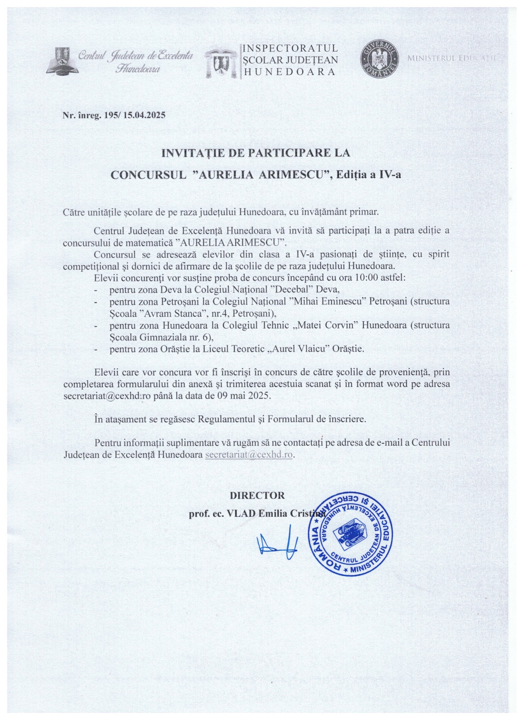 Centrul Județean de Excelență Hunedoara vă invită să participați la a patra ediție a concursului de matematică ”AURELIA ARIMESCU”.
