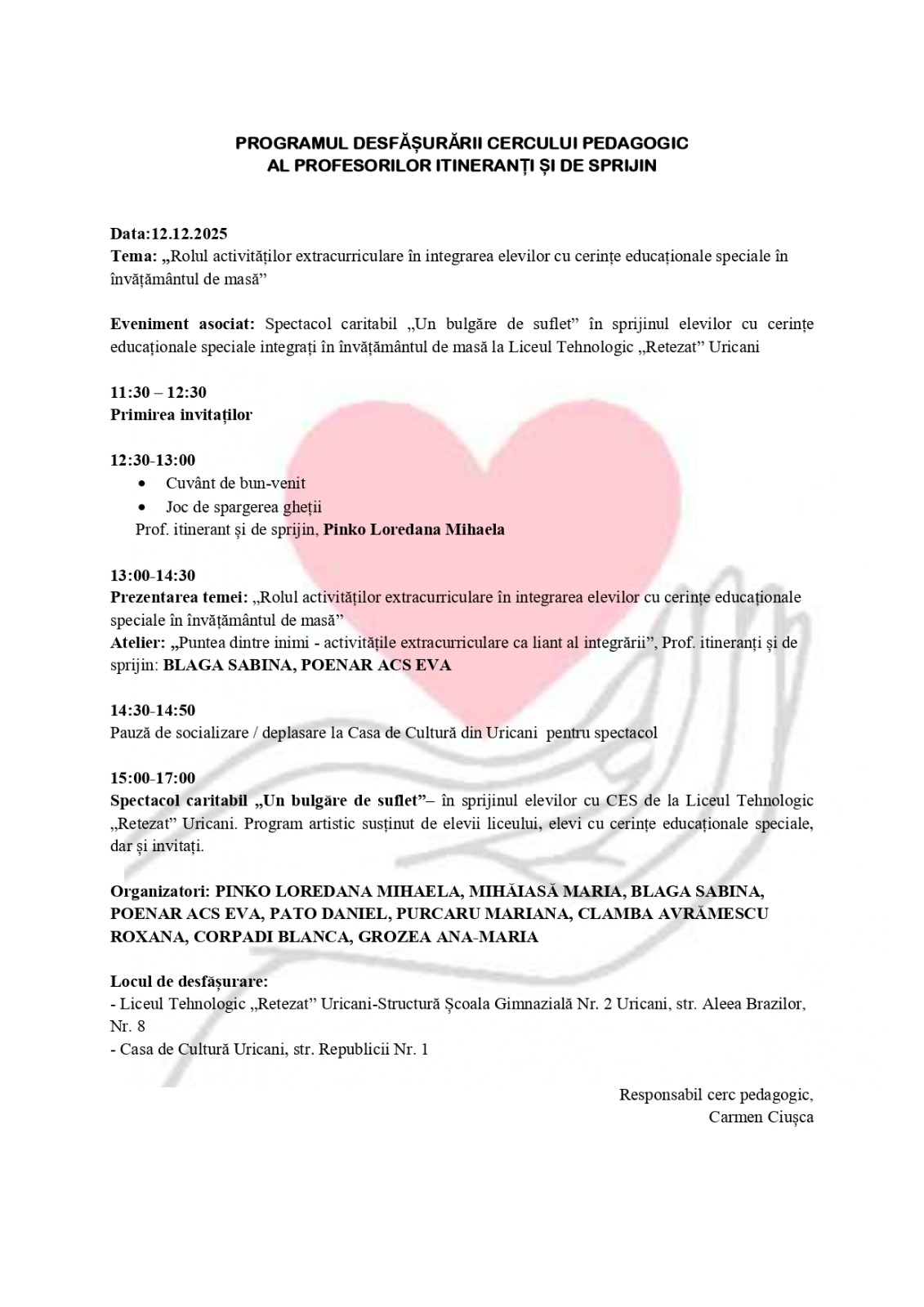 În data de 12.12.2025, cu începere de la ora 11.30, va avea loc Cercul pedagogic al profesorilor itineranți și de sprijin.