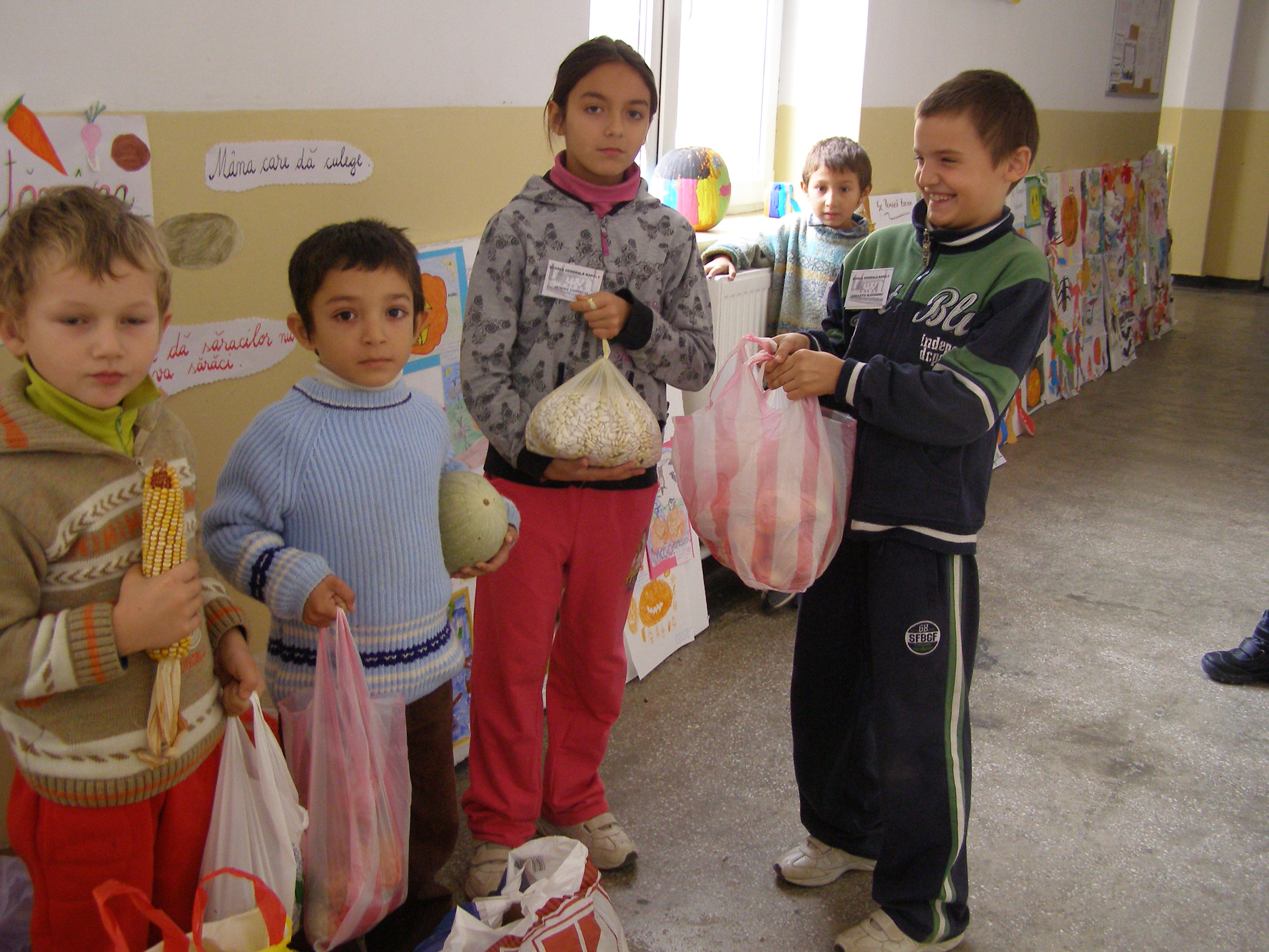 Au fost colectate si distribuite legume si fructe in urmatoarele cantitati:35 kg de cartofi, 20 kg de ceapa, 3 kg de usturoi, 6 kg de fasole, 10 kg de morcovi si patrunjel, 2dovleci comestibili)
