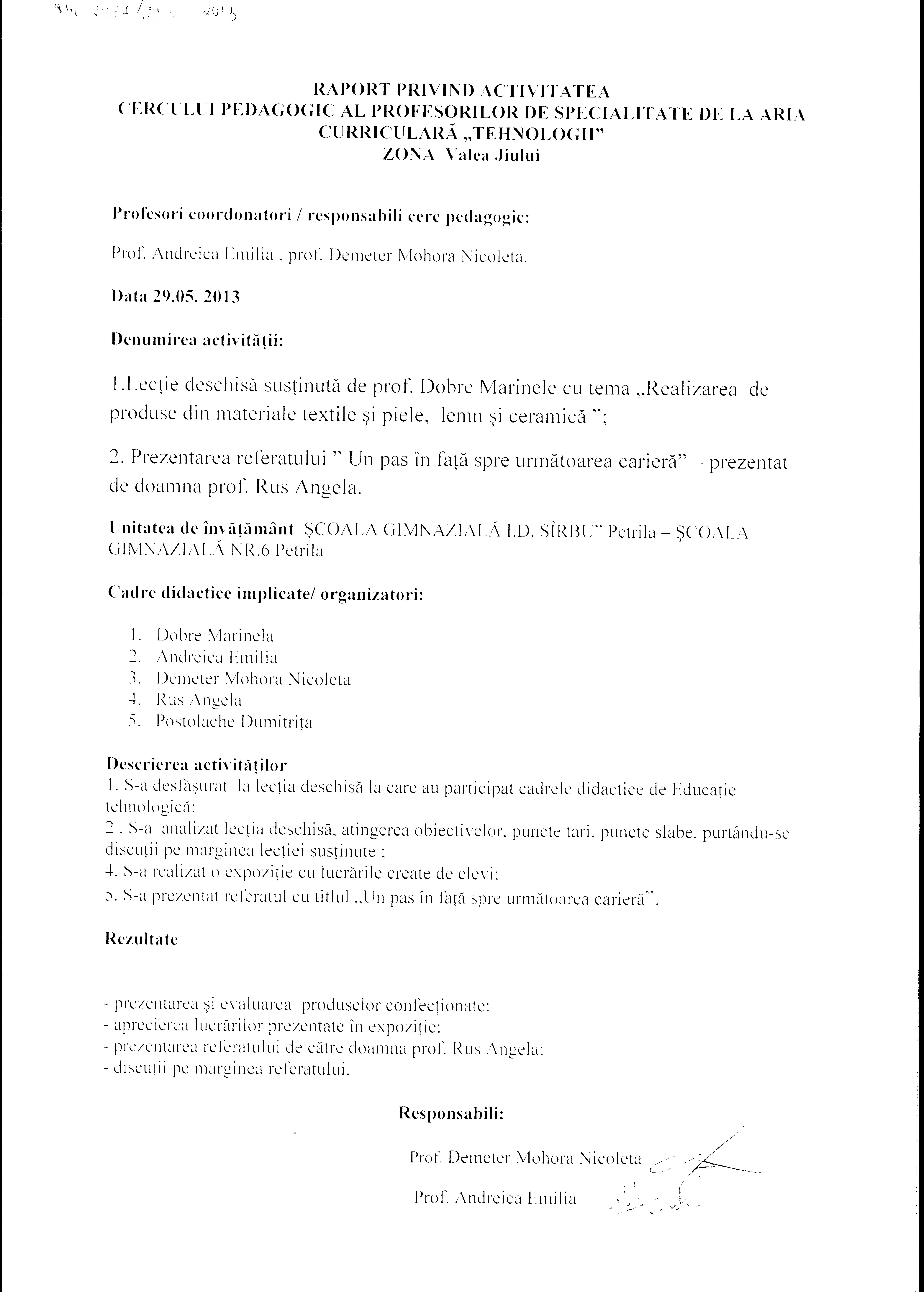 1. Raportul privind activitatea comisiei metodice a profesorilor de educatie tehnologică zona Hunedoara, Călan, Haţeg în luna martie 2013.