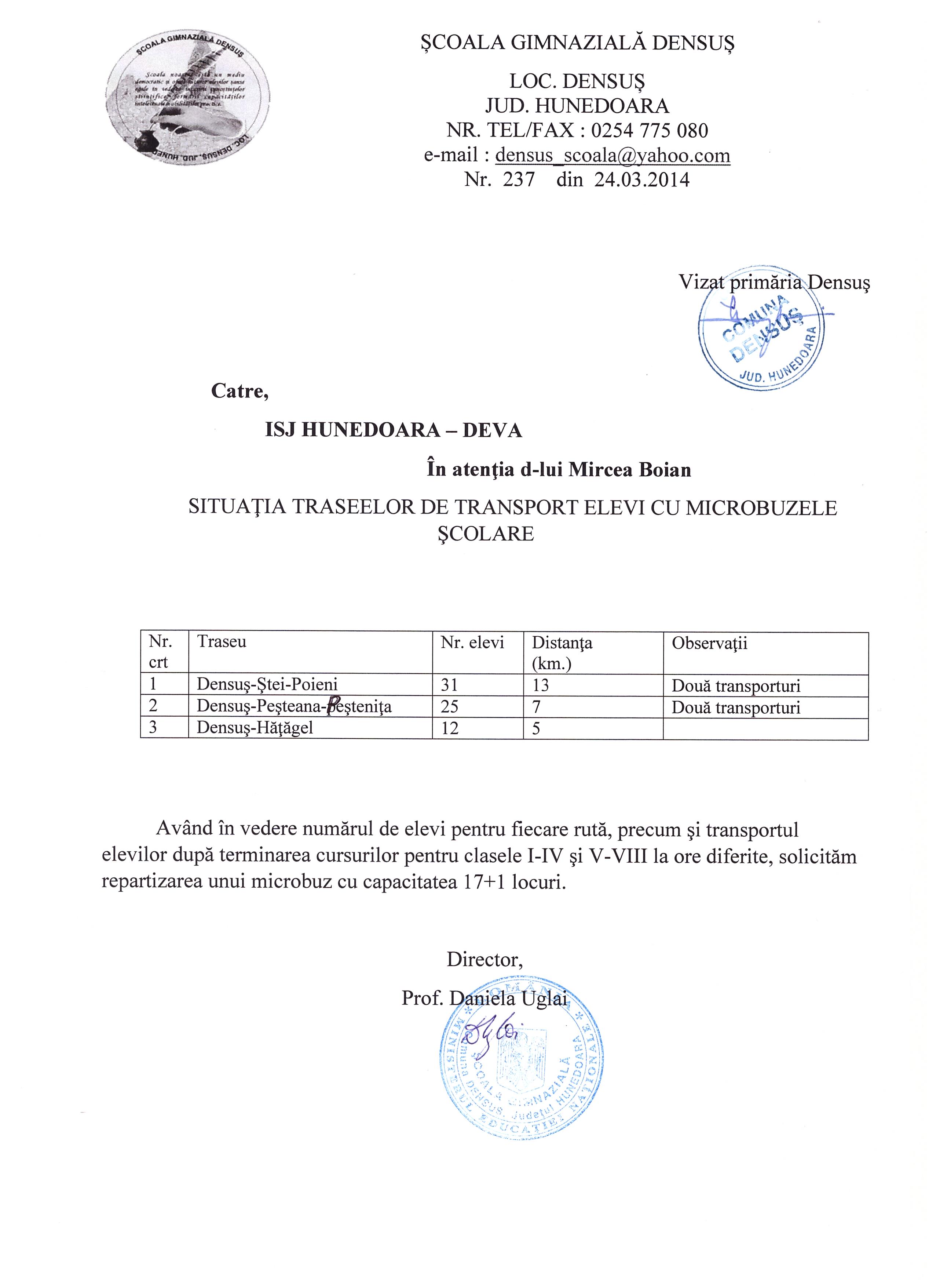 Pentru actualizarea bazei de date privind necesarul de microbuze scolare, va rugam ca pana in data de 24.03.2014 sa transmiteti in scris catre compartimentul tehnic, solicitarile dumneavoastra.
