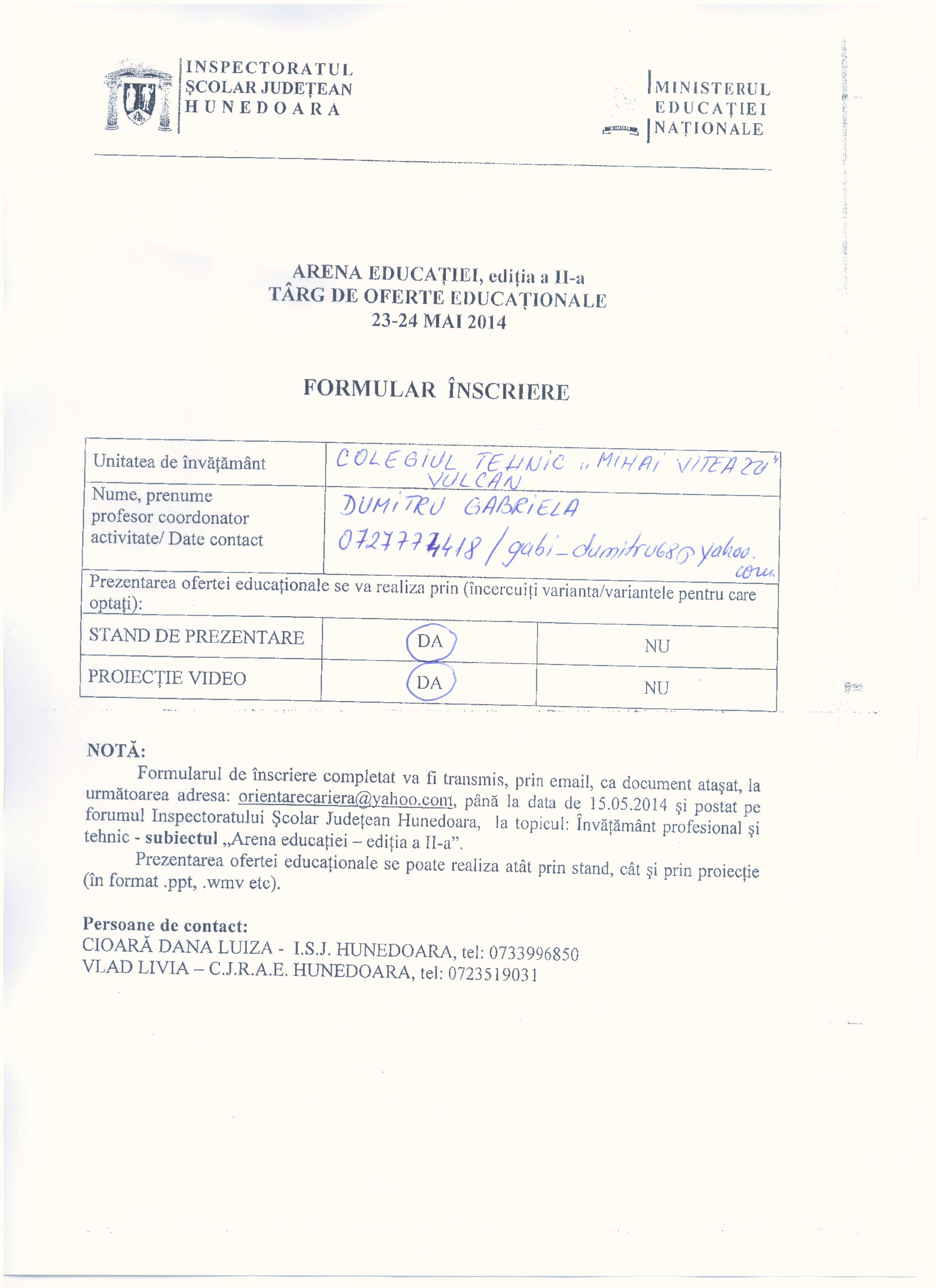 Fisa de inscriere Colegiul Tehnic CONSTANTIN BRANCUSI Petrila
