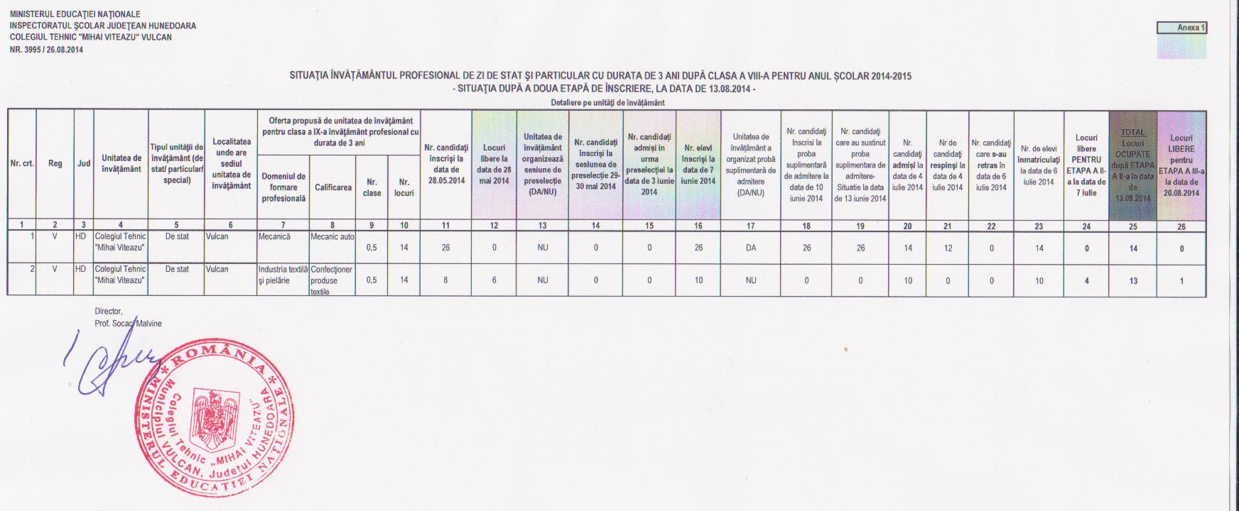 În data de 25.08.2014 s-a încheiat a doua etapă de înscriere în învăţământul profesional cu durata de 2 ani.