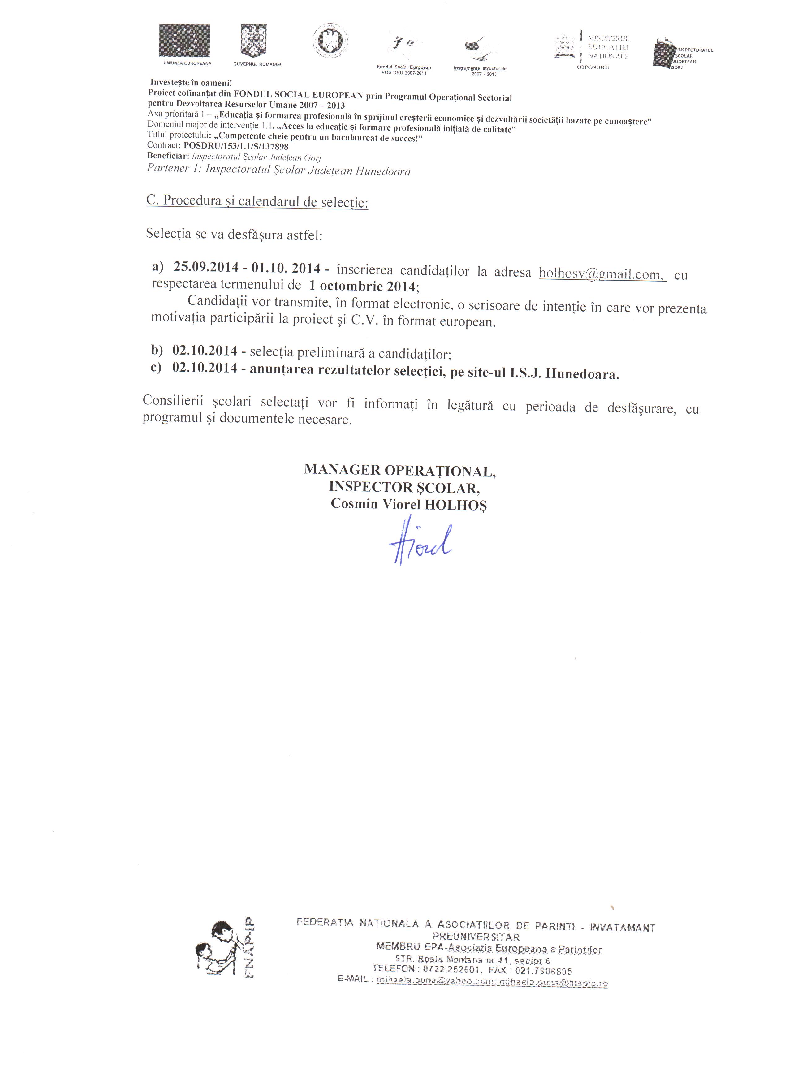 c) 02.10.2014 - anunţarea rezultatelor selecţiei, pe site-ul I.S.J. Hunedoara.