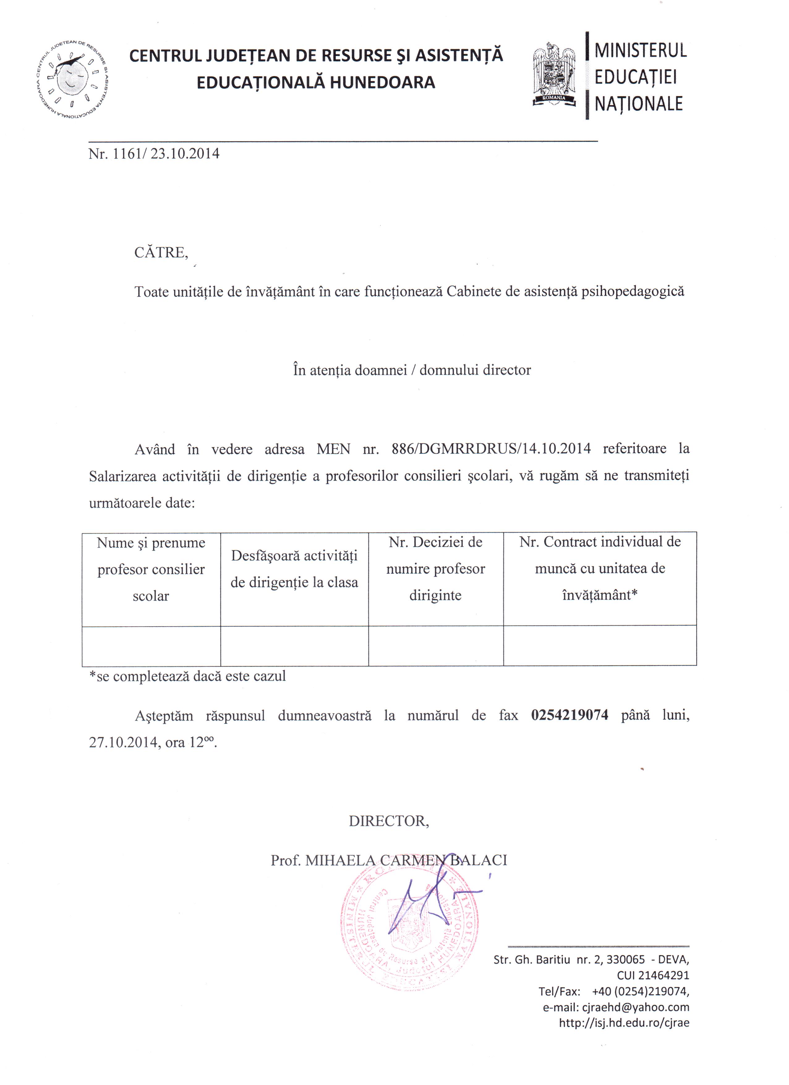 Având în vedere adresa MEN nr.886/DGMRRRDRUS/14.10.2014, referitoare la salarizarea activităţii de dirigenţie a profesorilor consilieri şcolari, vă rugăm să completaţi tabelul din adresa mai jos ataşată şi să ne transmiteţi până luni, 27.10.2014, ora 12.