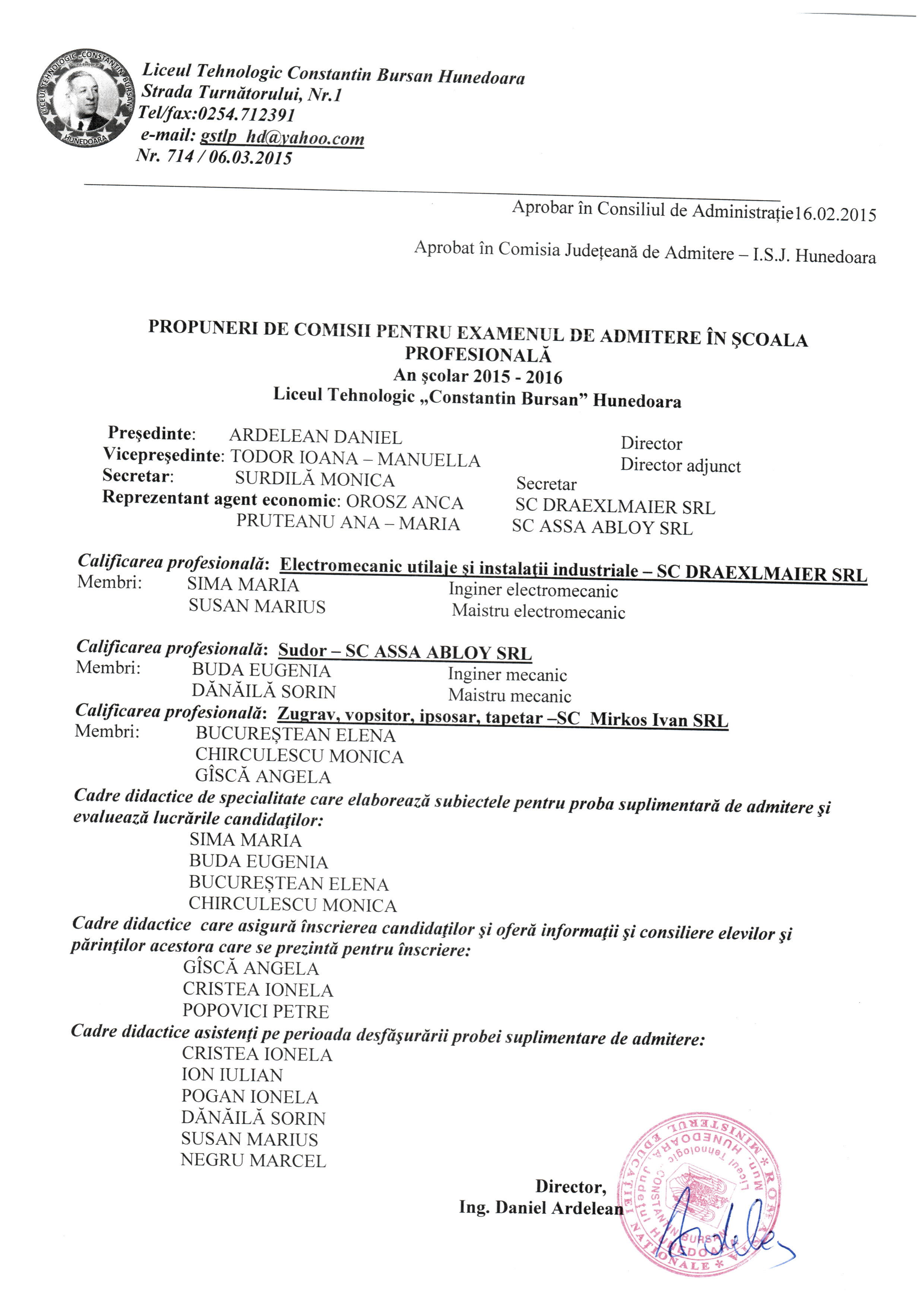 3. Până la data de 06.03.2015, veți transmite spre aprobare, la Inspectoratul Școlar Județean Hunedoara, a propunerii privind componența Comisiei de admitere din unitatea de învățământ care organizează învățământ profesional de stat cu durata de 3 ani, avizată de Consiliul de administrație al unității de învățământ.