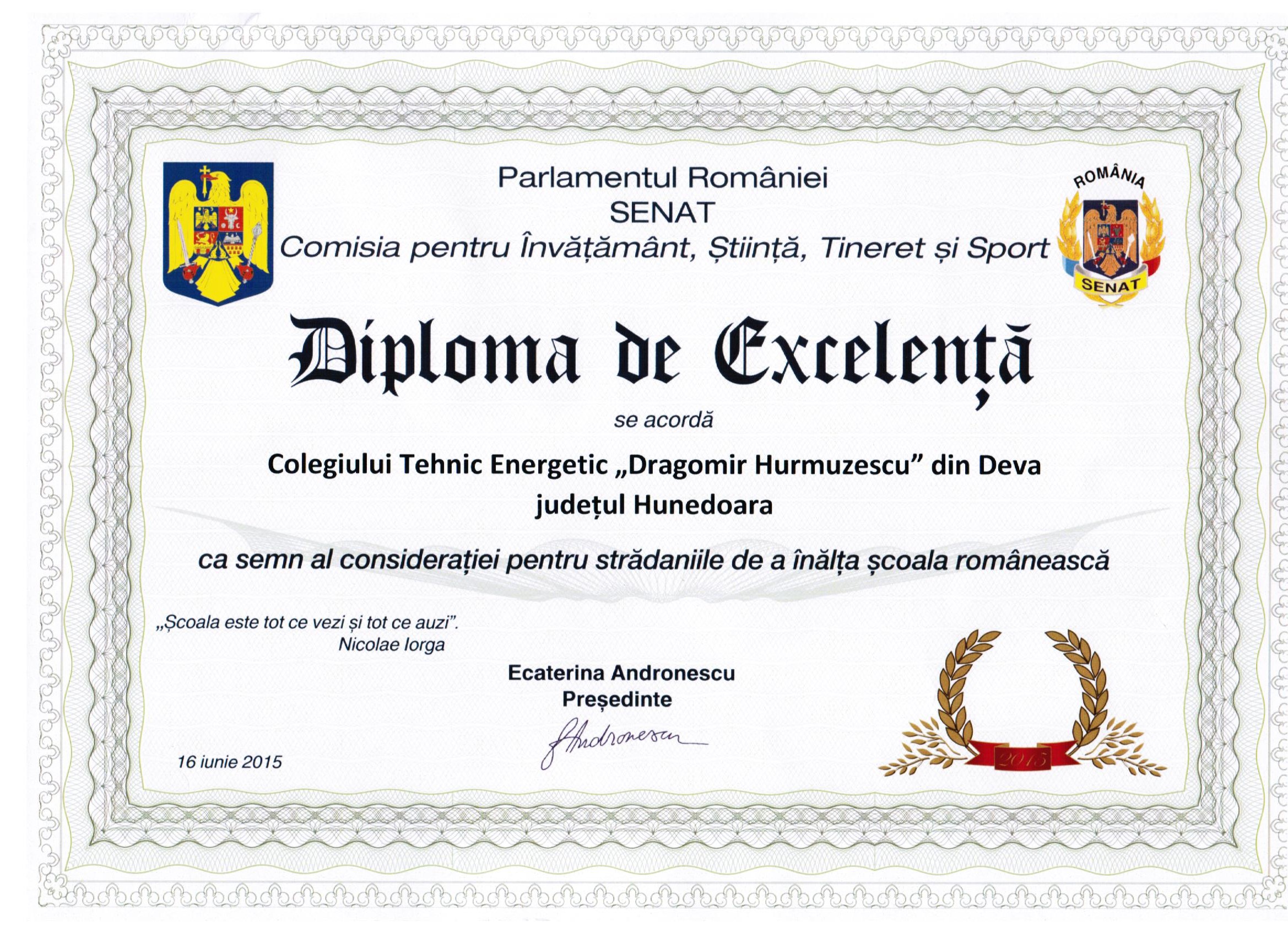 Pe lângă certificatul de „Școală Europeană”, în cadrul ceremoniei desfășurate în 16 iunie la Palatul Parlamentului, doamna Ecaterina Andronescu, președintele Comisiei pentru Învățământ, Știință, Tineret și Sport din Senat, a oferit școlii și o diplomă de excelență, ca „semn al considerației pentru strădaniile de a înălța școala românească”.