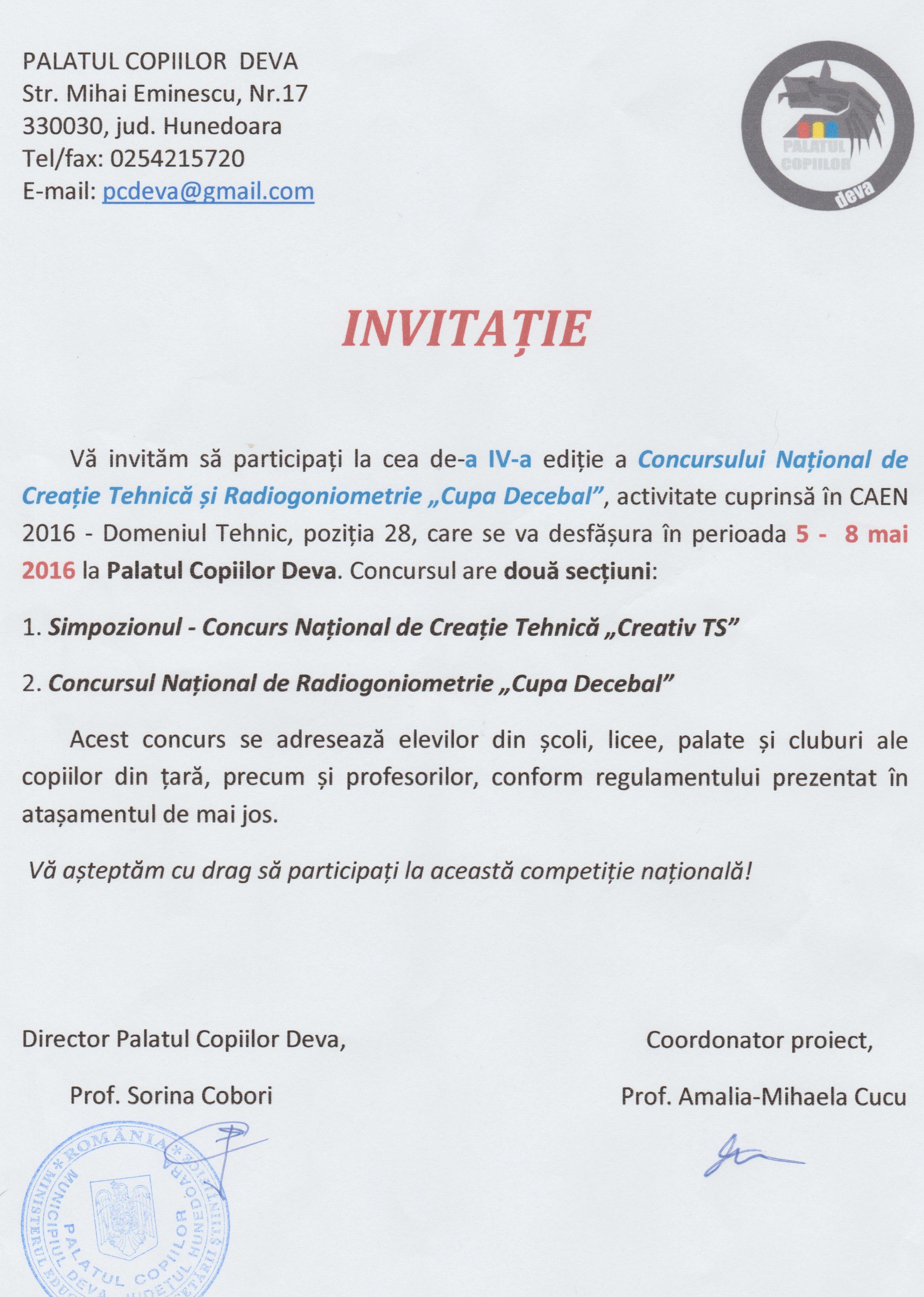 Vă invităm să participați la cea de-a IV-a ediție a Concursului Național de Creație Tehnică și Radiogoniometrie „Cupa Decebal”, activitate cuprinsă în CAEN 2016 - Domeniul Tehnic, poziția 28, care se va desfășura în perioada 5 - 8 mai 2016 la Palatul Copiilor Deva.