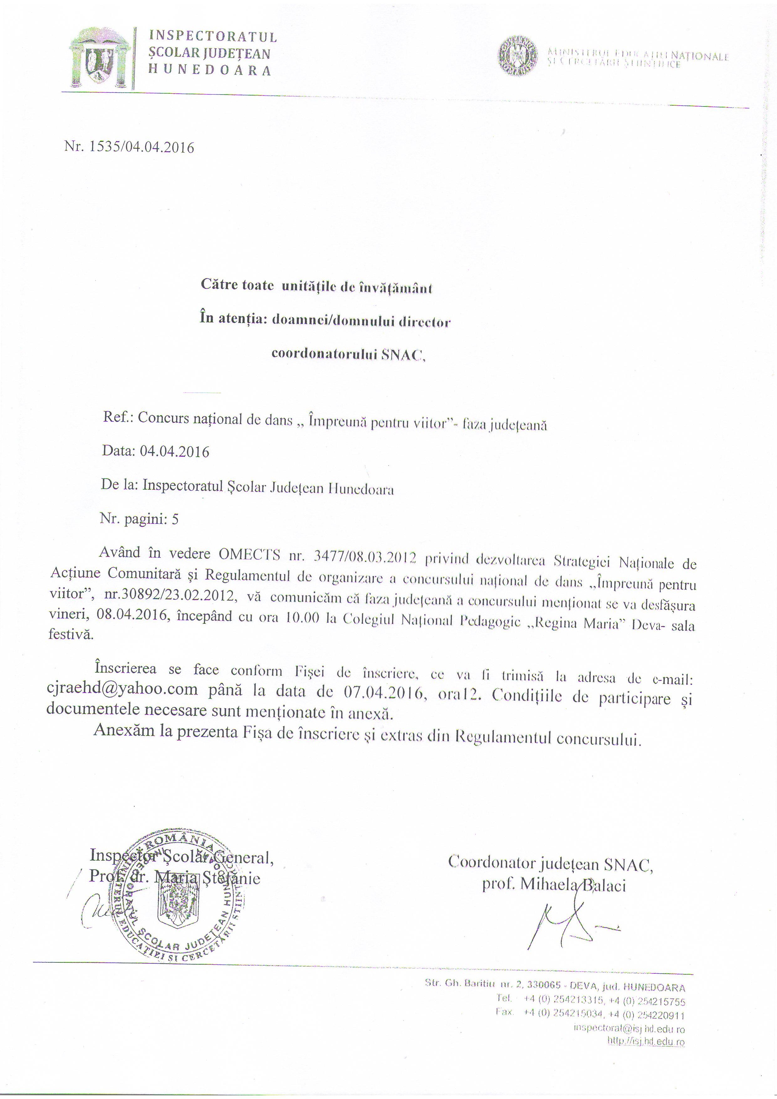 faza județeană a concursului național de dans ,,Împreună pentru viitor” din cadrul SNAC se va desfășura vineri, 08.04.2016, începând cu ora 10.00 la Colegiul Național Pedagogic ,,Regina Maria” Deva- sala festivă.