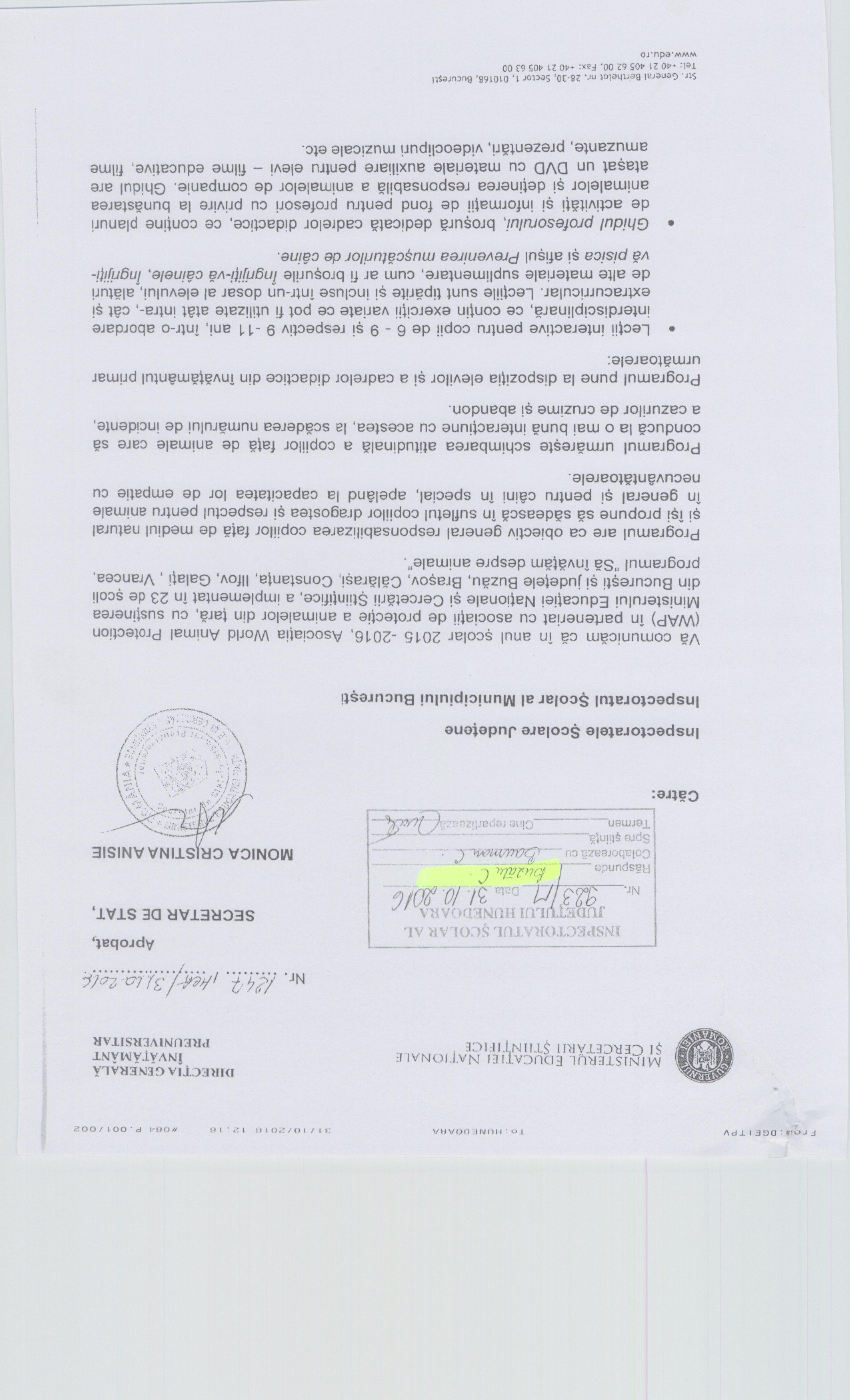 Asociația World Animal Protection (WAP) în parteneriat cu asociații de protecție a animalelor din țară, cu susținerea Ministerului Educației Naționale și Cercetării Științifice, implementează programul „SĂ ÎNVĂȚĂM DESPRE ANIMALE”. Programul are ca obiectiv general responsabilizarea copiilor față de mediul natural și își propune să sădească în sufletul copiilor dragostea și respectul pentru animale. Programul pune la dispoziția cadrelor didactice din învățământul primar lecții interactive, ghidul profesorului, un site în limba română unde toate materialele pot fi descărcate gratuit.