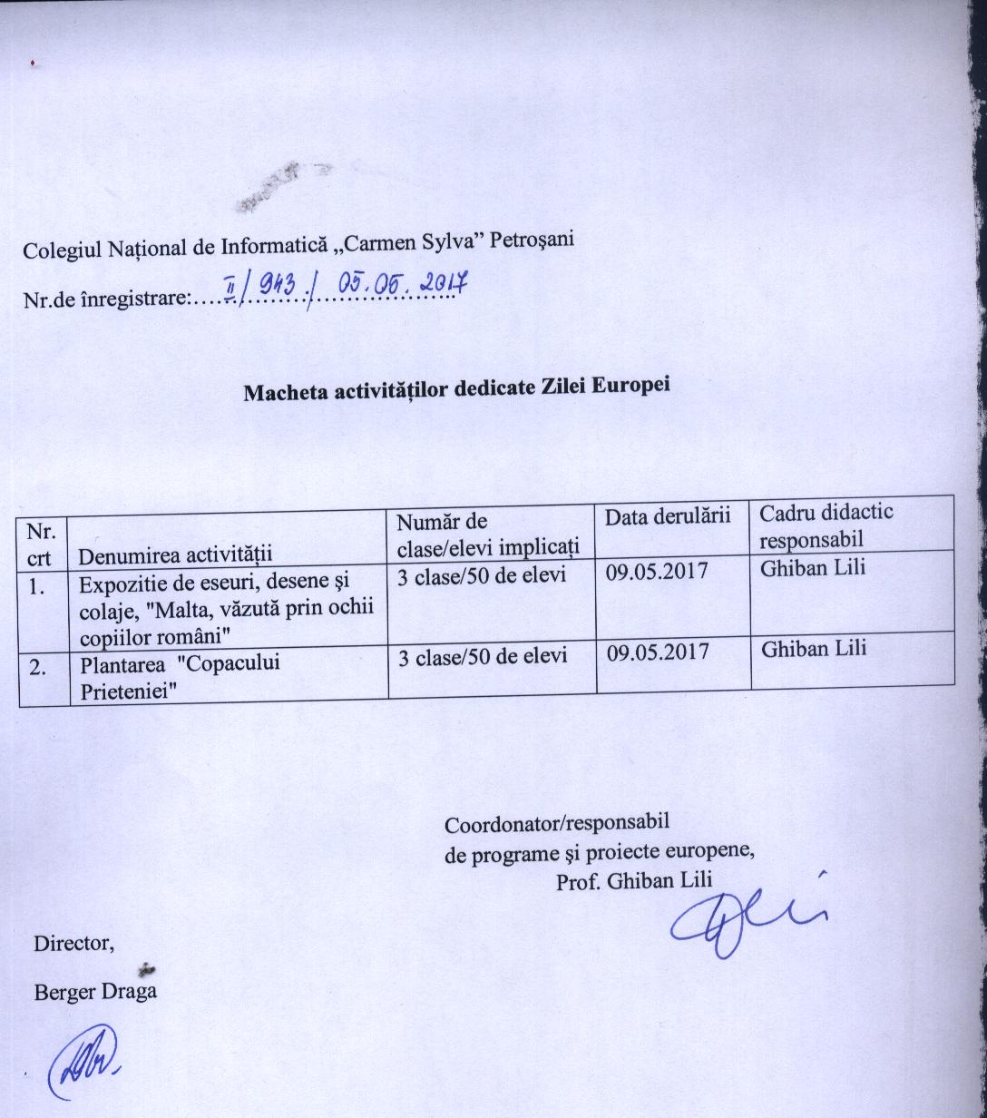 Vă transmitem macheta activităţilor dedicate Zilei Europei - CNI ”C. Sylva” Petroșani - școala gimnazială