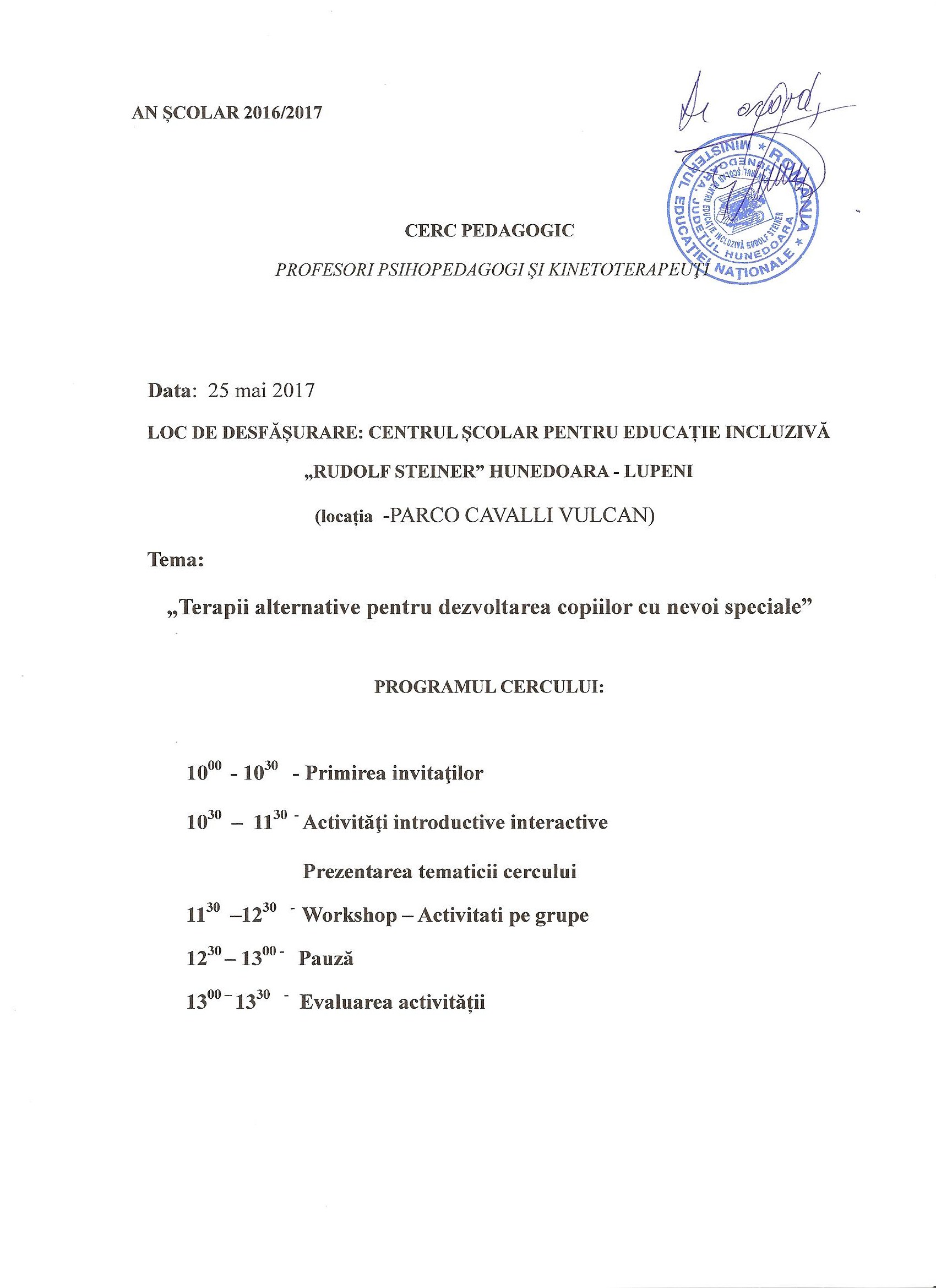 Stimați colegi, atașez programul cercului pedagogic al profesorilor psihopedagogi și kinetoterapeuți, care se va derula în data de 25 mai 2017, începând cu ora 10.00, la Centrul Școlar pentru Educație Incluzivă Rudolf Steiner Hunedoara, locația Lupeni.