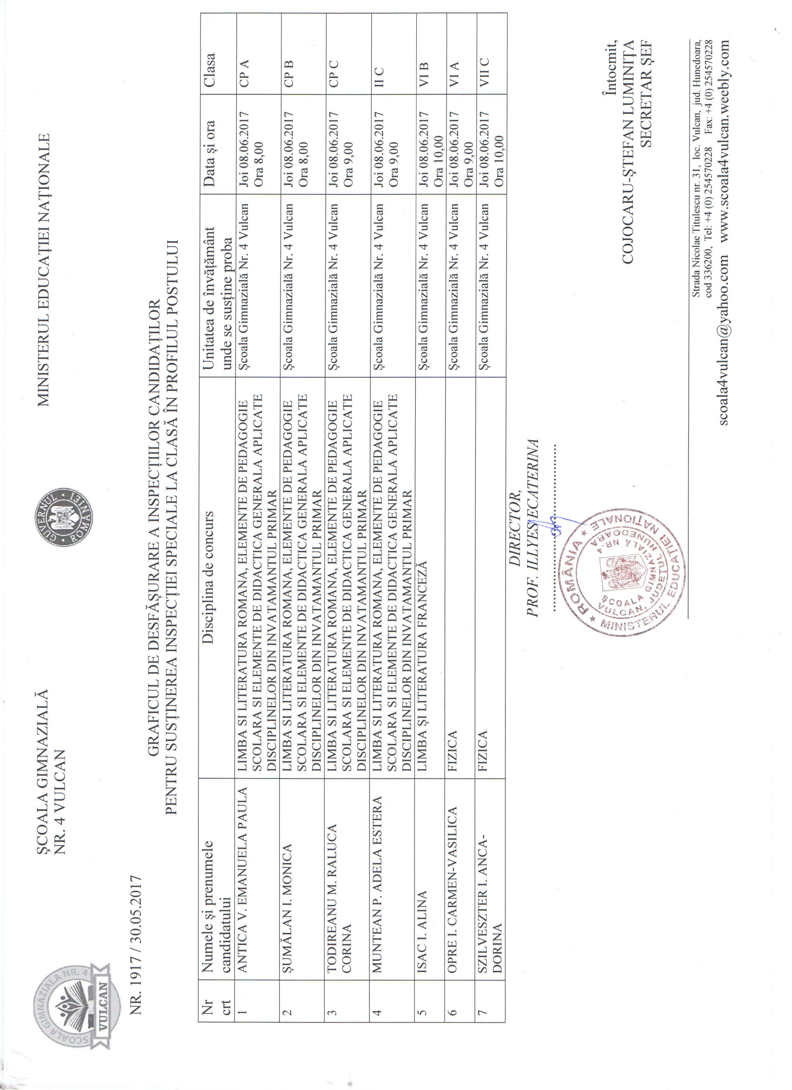 Datorită faptului că în săptămâna 29.05.2017-02.06.2017 la Şcoala Gimnazială Nr. 4 Vulcan se desfăşoară programul naţional "Şcoala altfel", susţinerea inspecţiilor speciale la clasă s-a reprogramat conform graficului din ataşament.