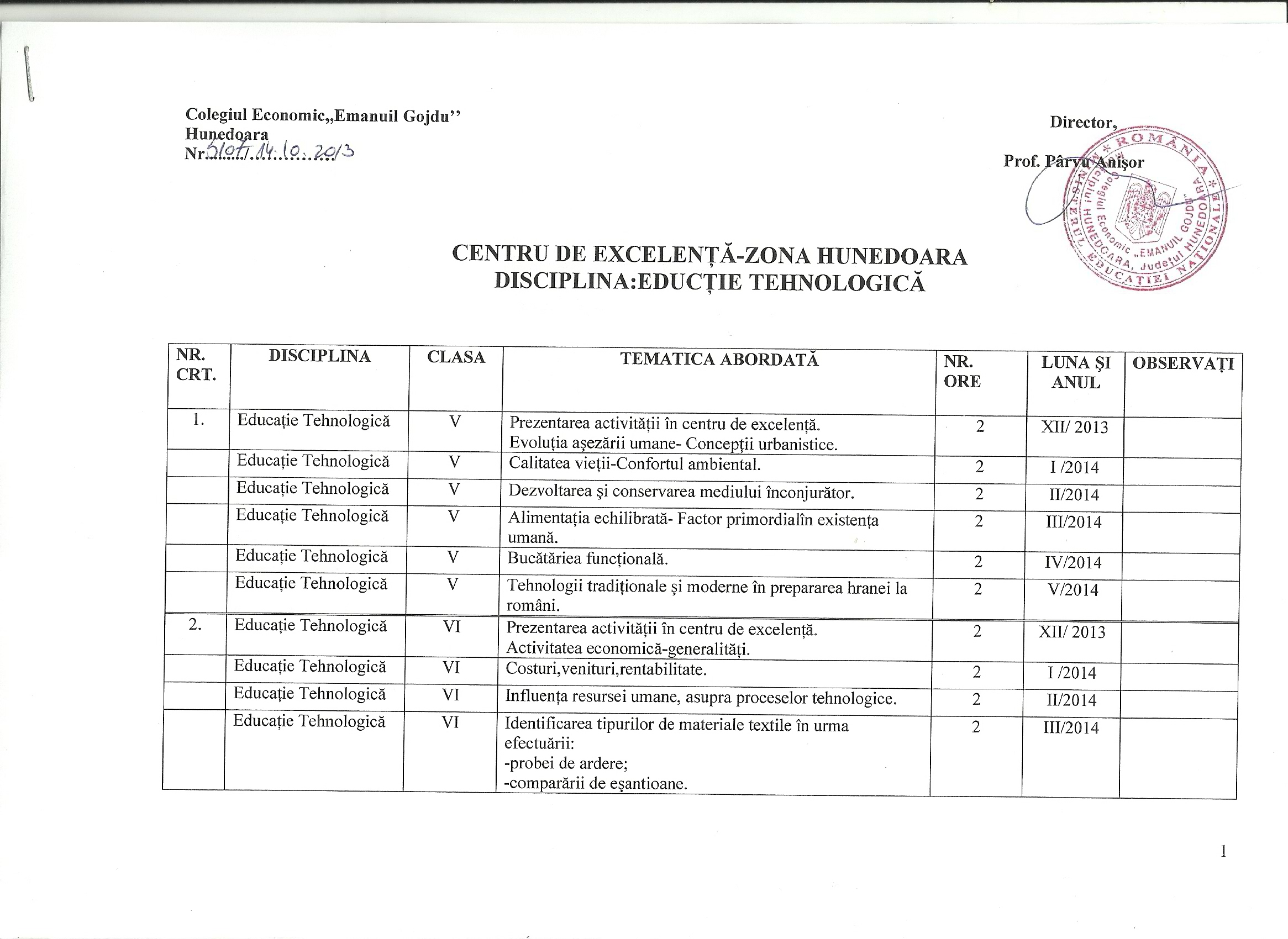 GRAFICUL DE ACTIVITĂŢI - Cercul pedagogic al profesorilor de Educație Tehnologică, an școlar 2013-1014, zona Hațeg.