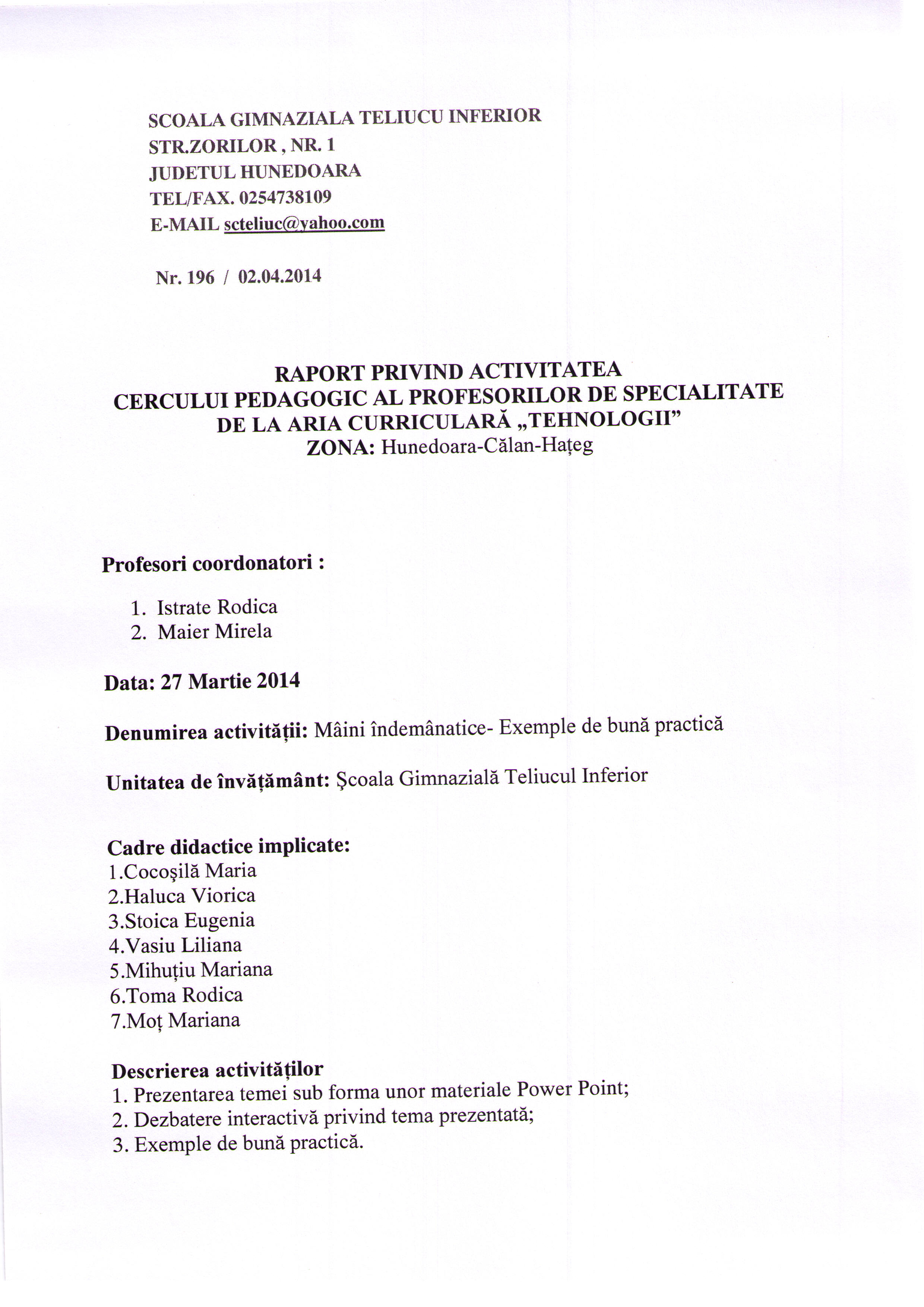 Vă atașăm raportul privind activitatea cercului pedagogic al profesorilor de specialitate de la aria curriculară "Tehnologii" zona Brad-Ilia, din data de 7.04.2014