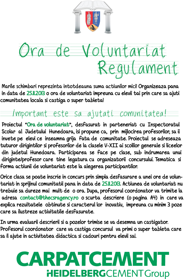 CARPATCEMENT - HEIDELBERGCEMENT Group în parteneriat cu Inspectoratul Şcolar Judeţean Hunedoara implementează în anul şcolar 2013-2014 proiectul "Ora de voluntariat".