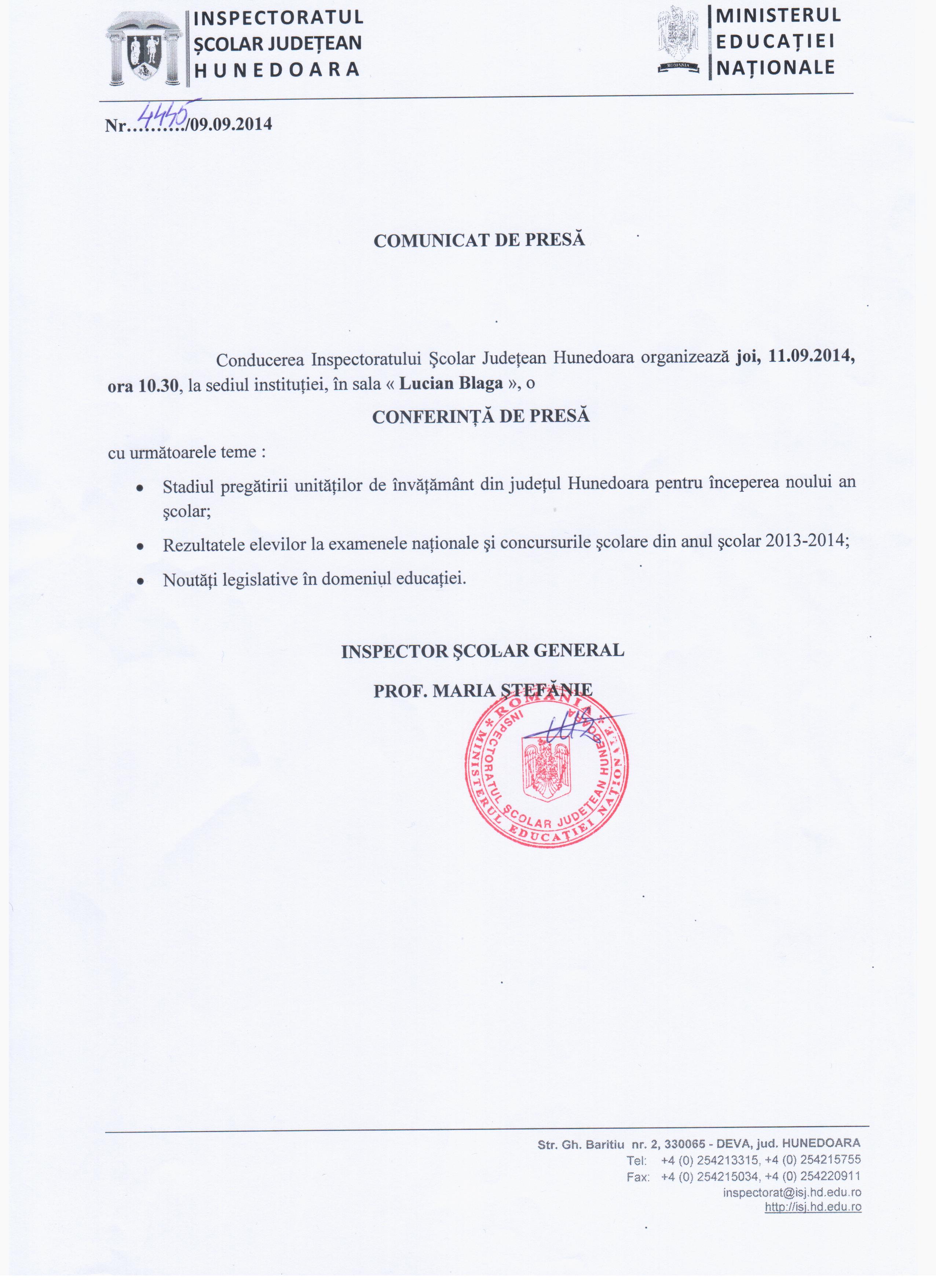 Atașăm comunicatul de presă cu privire la Conferința de presă din data de joi, 11.09.2014.