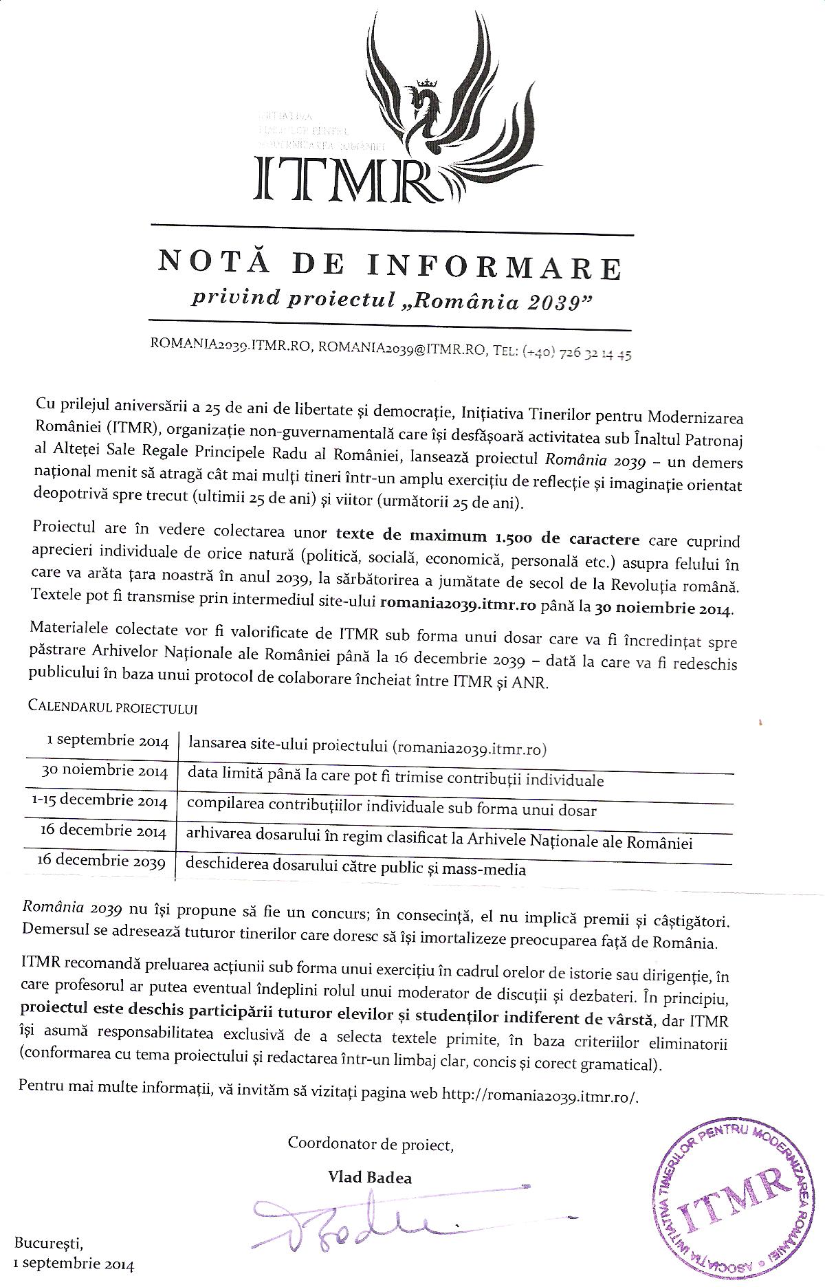 În ataşament veţi găsi Nota de informare privind proiectul România 2039 organizat de Asociaţia Iniţiativa Tinerilor pentru Modernizarea României (ITMR).