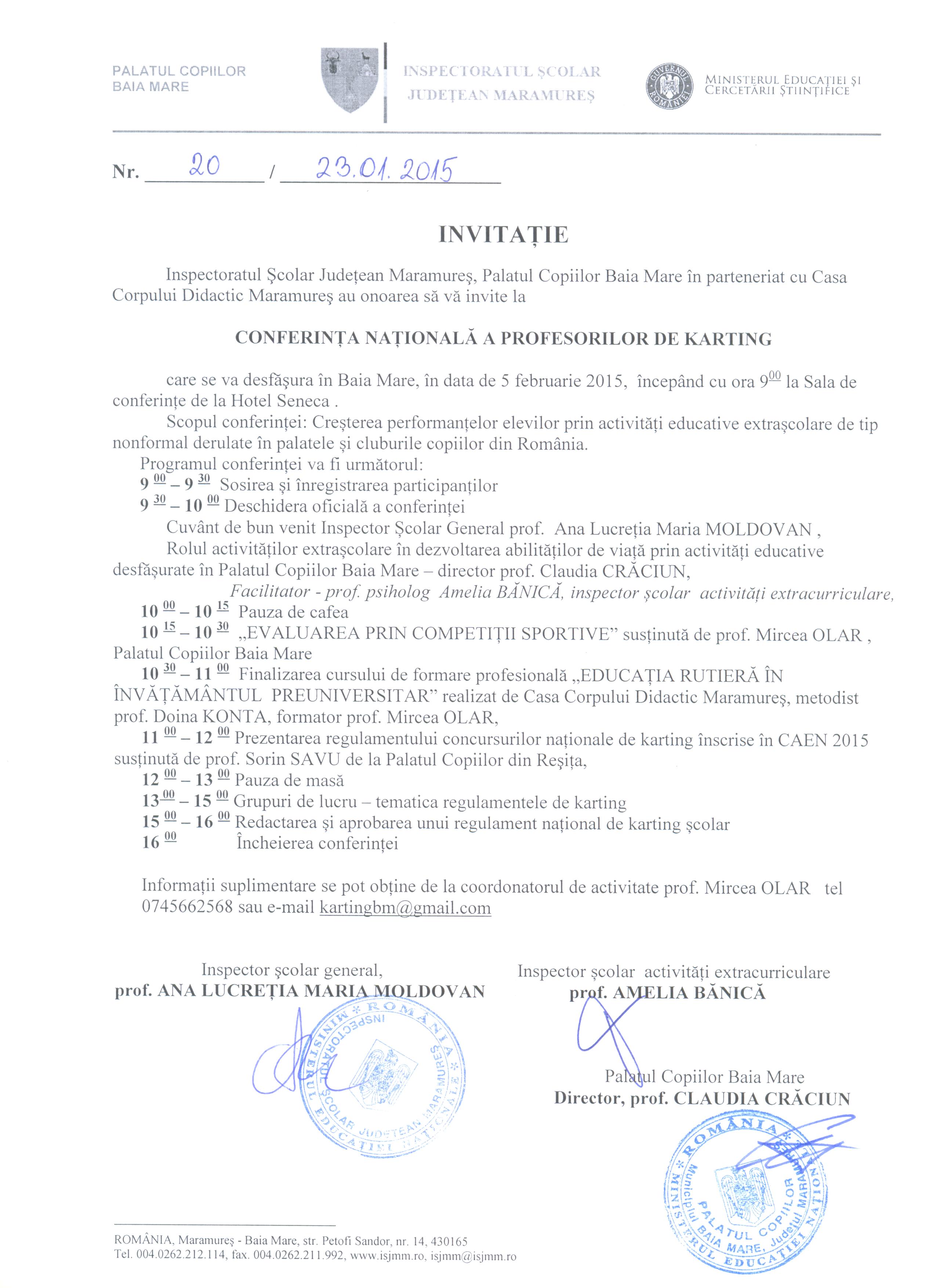 În atașament aveți invitația la Conferința Națională a profesorilor de karting, care se va desfășura la Baia Mare, în data de 5 februarie 2015, începând cu ora 9.00.