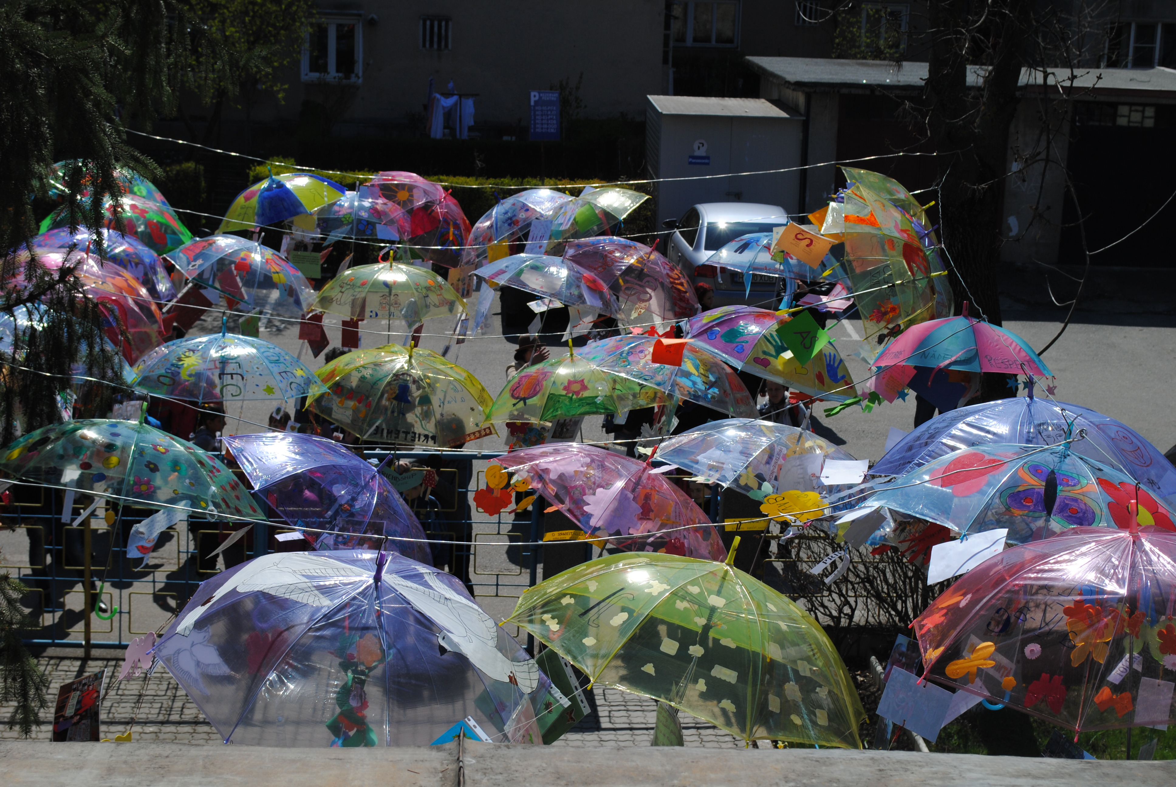 La finalul activităţii, umbreluţele au fost suspendate pe sârmă, cu mare grijă, în faţa intrărilor principale ale celor 2 clădiri ale şcolii, precum şi în curtea şcolii, spre bucuria realizatorilor lor, spre admiraţia publicului larg, al trecătorilor, al celor dispuşi să le acorde un zâmbet prietenos…