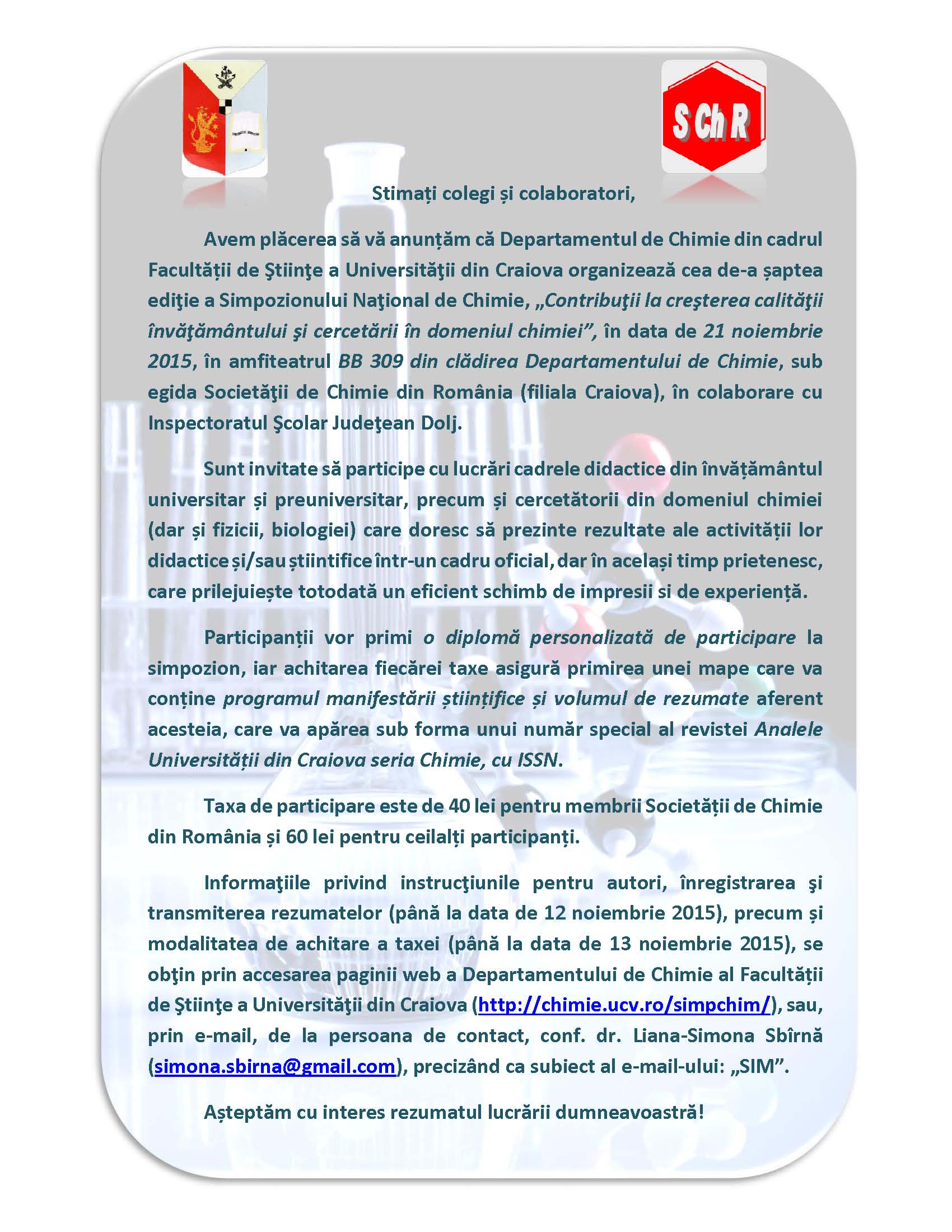 Atasez acestui mesaj anuntul simpozionului organizat de Departamentul de Chimie al Facultatii de Stiinte al Universitatii din Craiova.