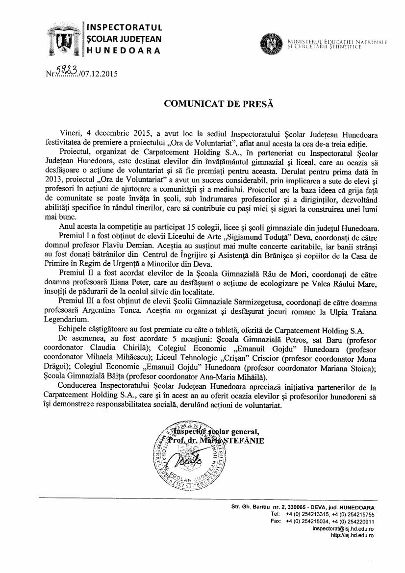 Vineri, 4 decembrie 2015, a avut loc la sediul Inspectoratului Școlar Hunedoara festivitatea de premiere a proiectului „Ora de Voluntariat”, derulat de Carpatcement Holding S.A., în parteneriat cu ISJ Hunedoara.