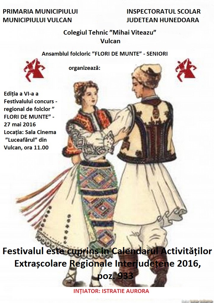 Vă invităm la Ediția a VI-a a Festivalului-concurs de folclor regional ”Flori de munte”, aprobat în CAERI, poz. 933. Regulamentul, fișa de înscriere și alte detalii se află în fișierele atașate. Vă așteptăm cu drag!!! Recital - Ansamblul ”Flori de munte” - seniori - al cadrelor didactice din Valea Jiului.