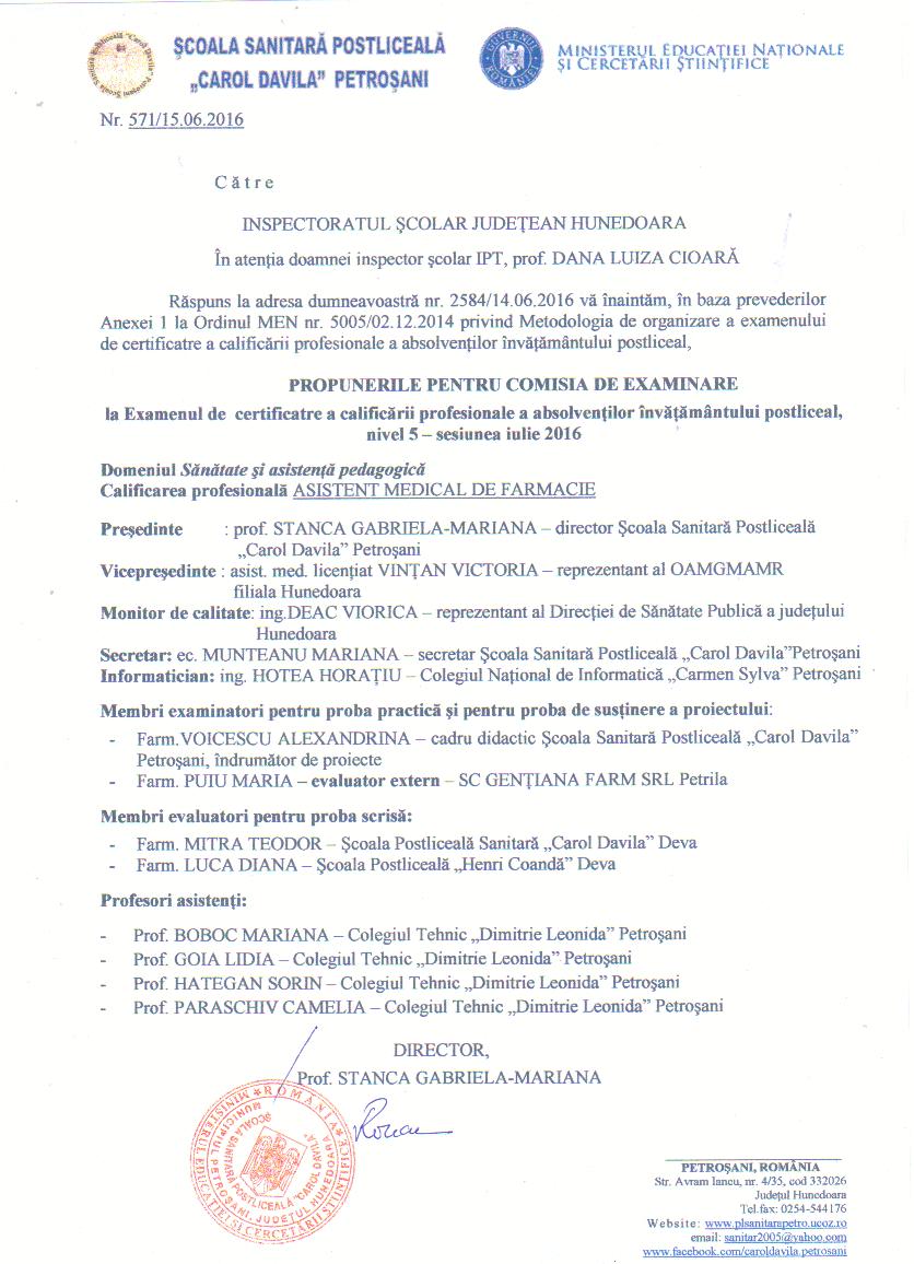 Propuneri comisii examen de certificare nivel 5 de la Scoala Postliceala Sanitara Hunedoara sesiunea IULIE 2016