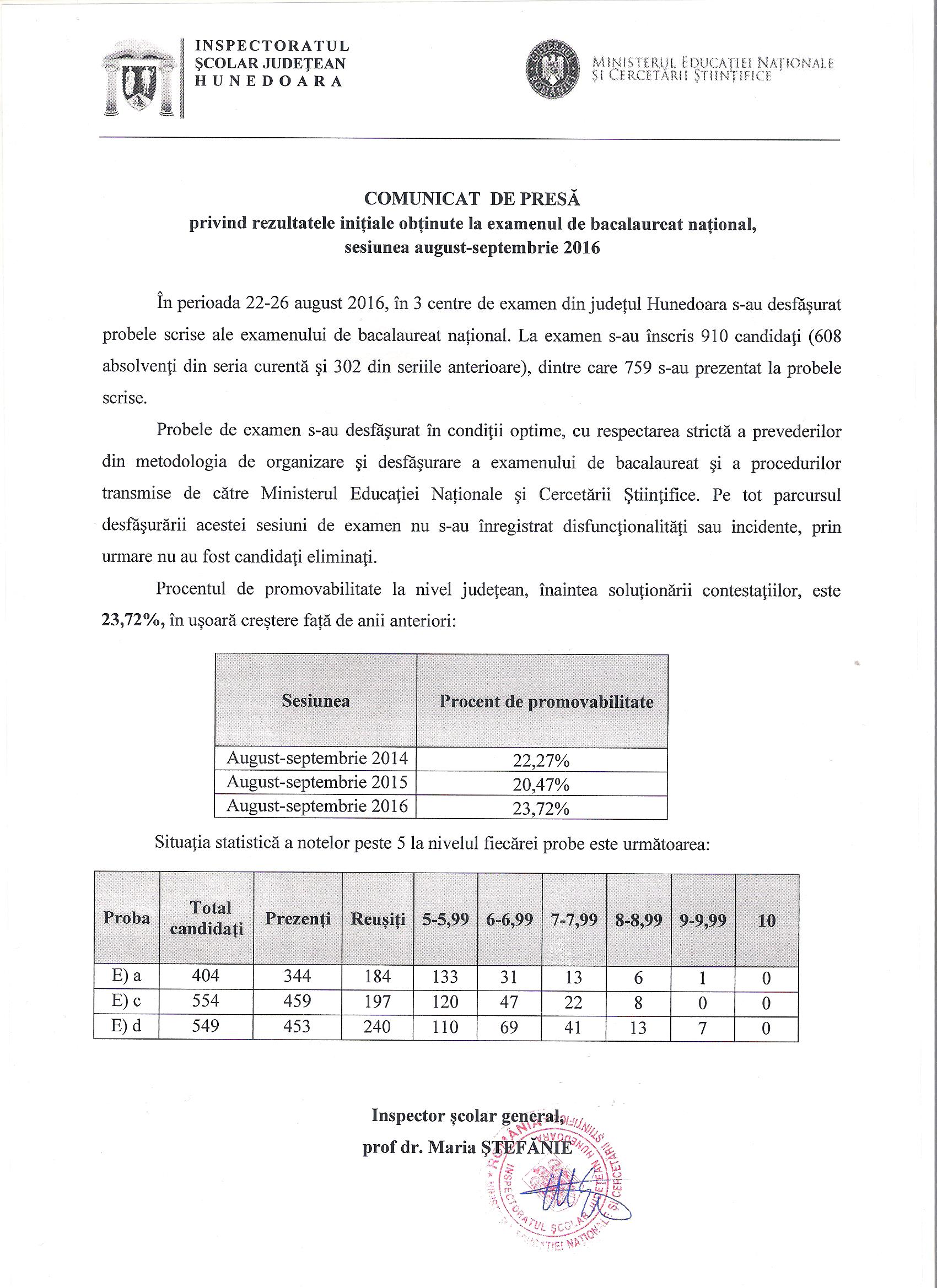 În atașament găsiți comunicatul de presă referitor la rezultatele înainte de contestații, obținute de candidații din județul Hunedoara la examenul național de bacalaureat, sesiunea august-septembrie 2016.