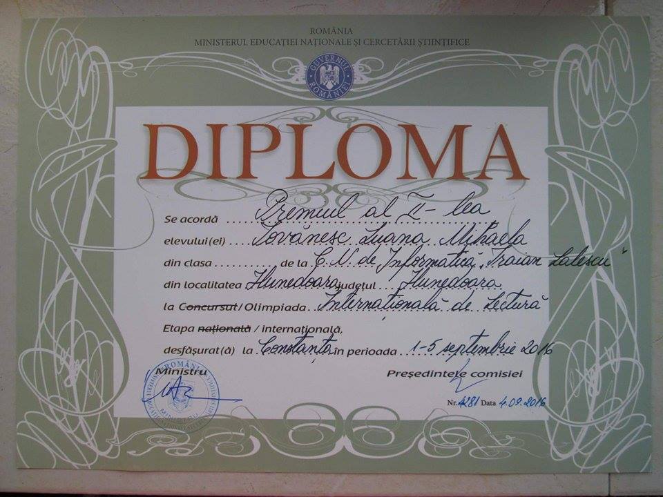 Județul Hunedoara a fost reprezentat cu succes la această competiție internațională de către eleva Luana Mihaela IOVĂNESC (clasa a X-a), de la Colegiul Național de Informatică „Traian Lalescu” Hunedoara, care a obținut premiul II. Eleva a fost îndrumată de către doamna profesoară Carmen LUPESCU și s-a calificat la etapa internațională după ce s-a clasat a doua la etapa națională a Olimpiadei „Lectura ca abilitate de viață”.