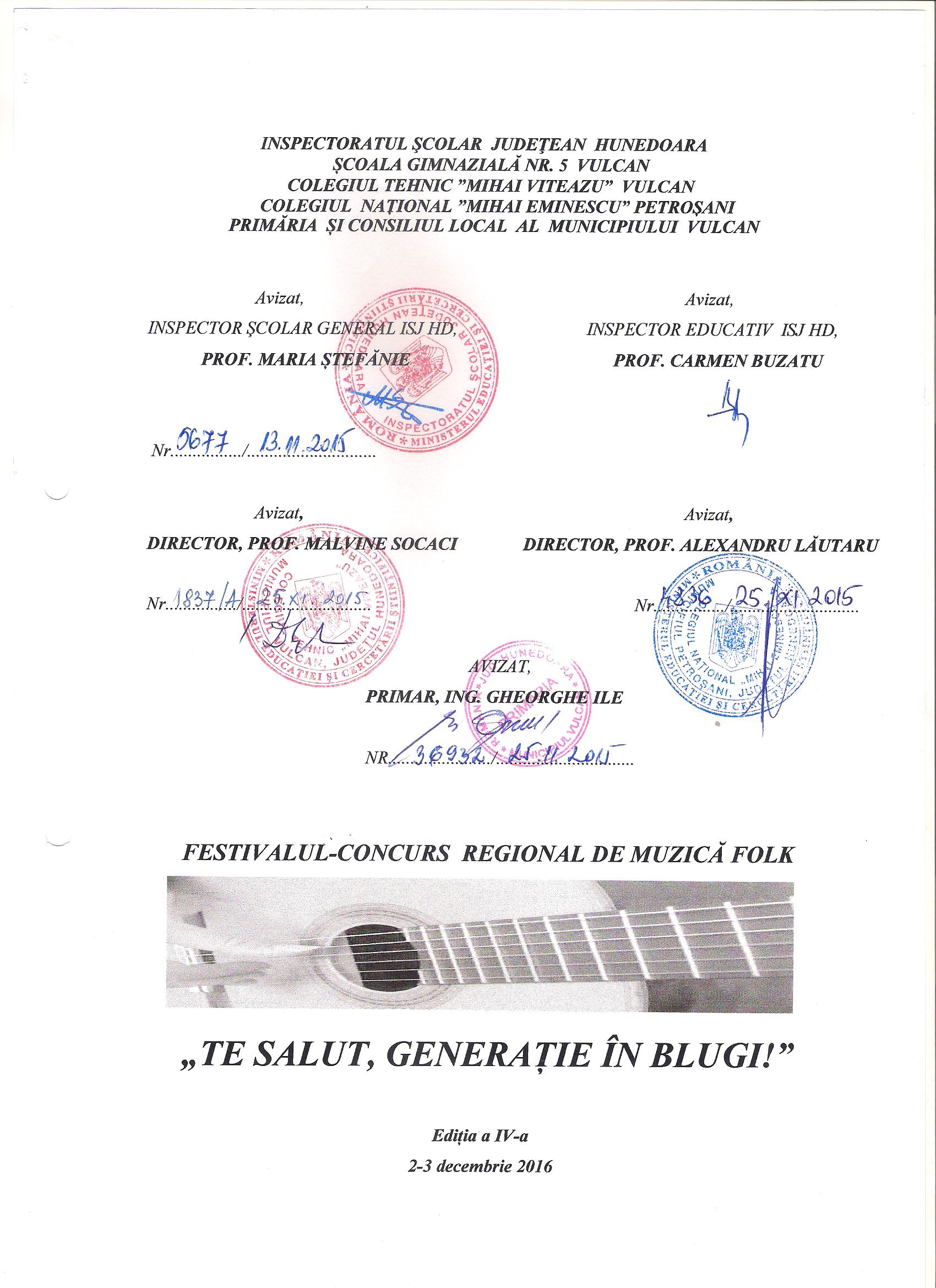 Școala Gimnazială Nr. 5 Vulcan vă invită să luați parte la cea de-a IV-a ediție a Festivalului-concurs regional de muzică folk „Te salut, generație în blugi!”(in memoriam Adrian Păunescu). Concursul va avea loc în data de 3 decembrie 2016, în sala cinematografului „Luceafărul” din Vulcan. Proiectul este cuprins în CAERI 2016, la poziția 899. În fișierele atașate, găsiți detalii și fotografii de la ediția anterioară. Vă așteptăm cu mult drag!