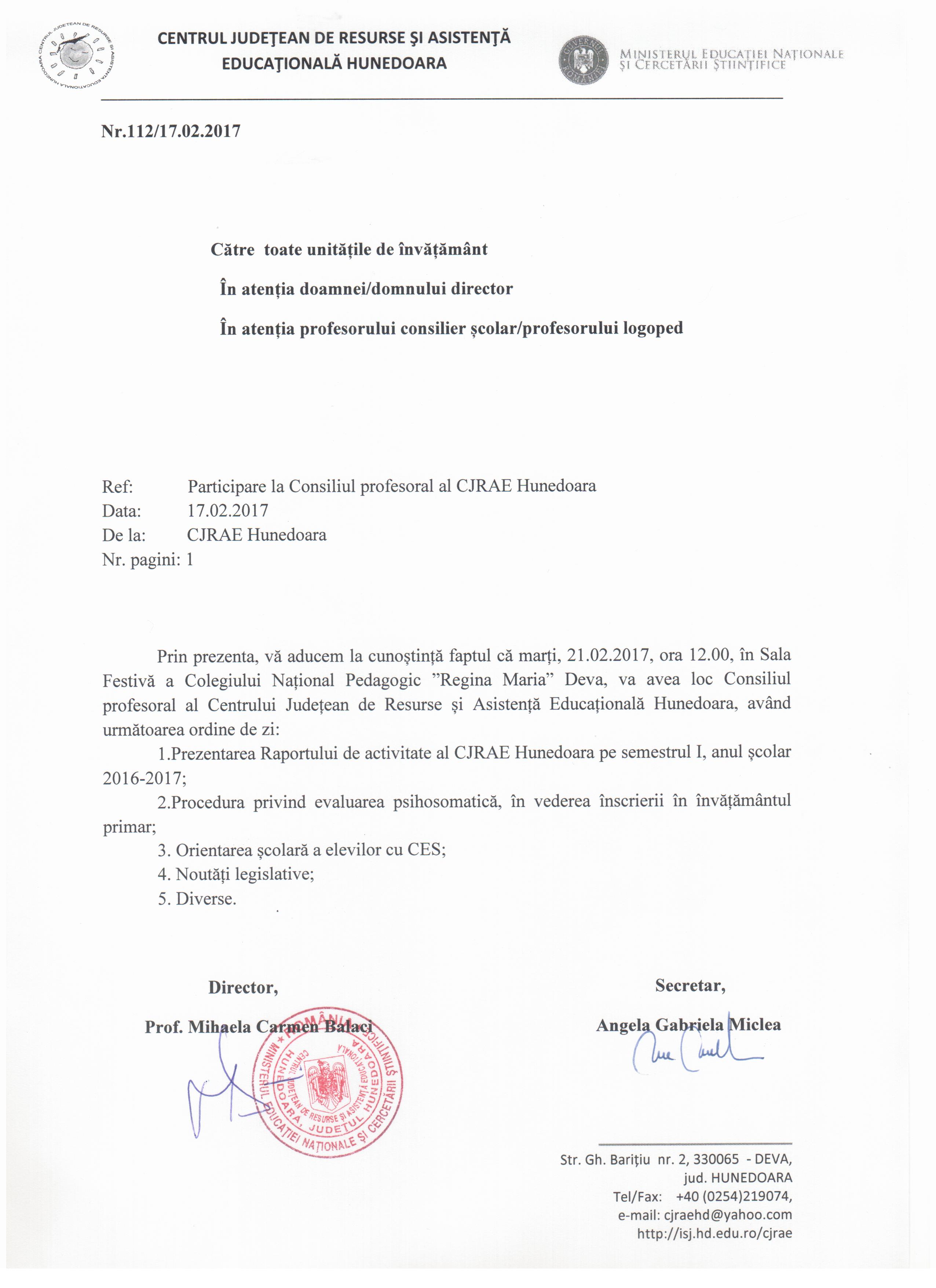 Prin prezenta, vă aducem la cunoștință faptul că marți, 21.02.2017, ora 12.00, în Sala Festivă a Colegiului Național Pedagogic ”Regina Maria” Deva, va avea loc Consiliul profesoral al Centrului Județean de Resurse și Asistență Educațională Hunedoara, având următoarea ordine de zi:
