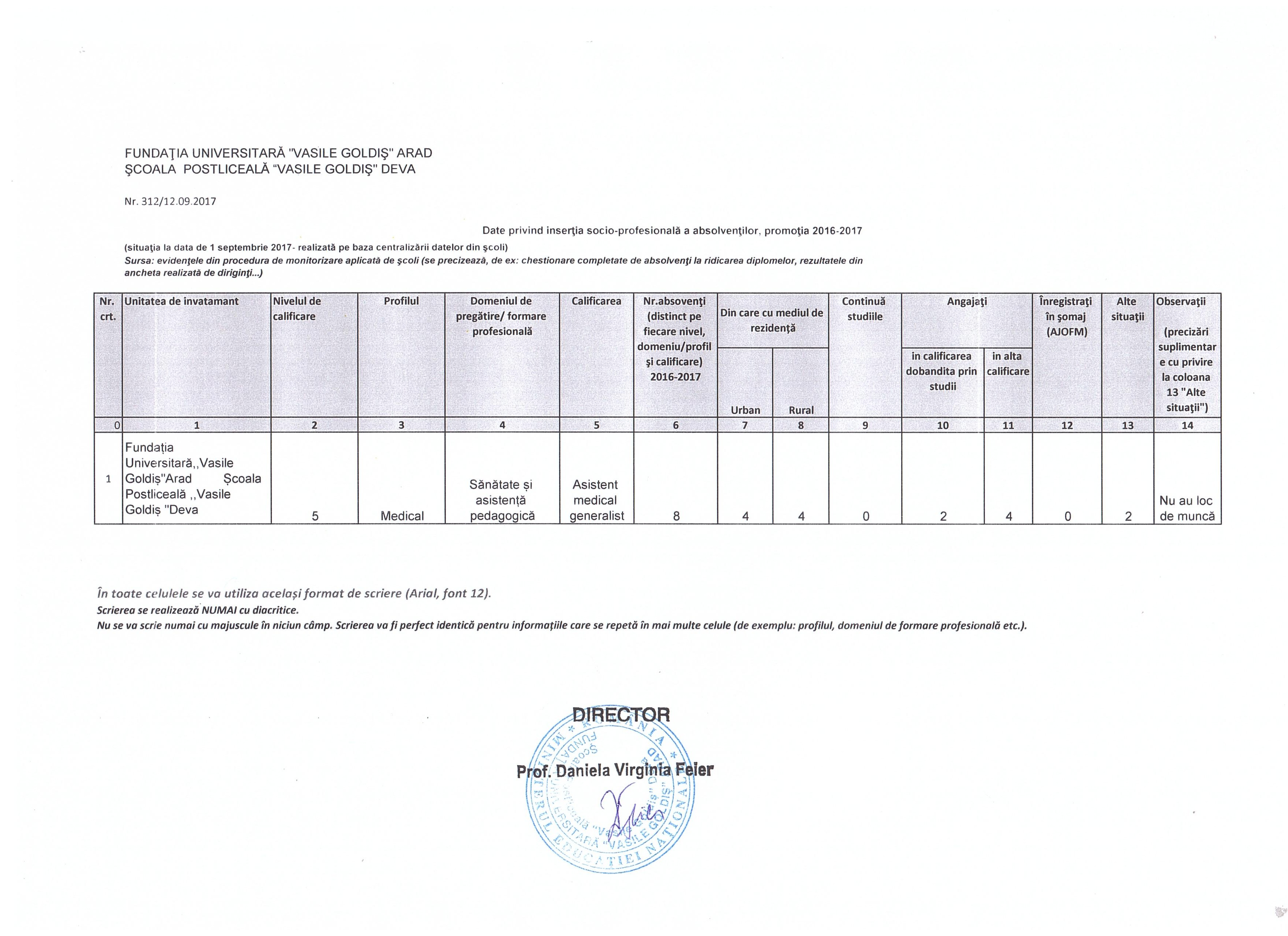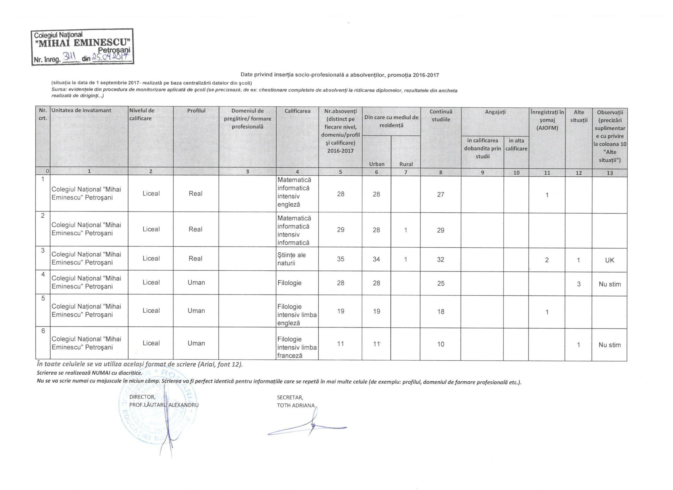 Ca urmare a adresei nr. 4916/11.09.2017, referitor la Ordinul M.E.N. nr. 3547/15.04.2013 privind Metodologia pentru monitorizarea inserției socio-profesionale a absolvenților de învățământ liceal, vă trimitem în atașament macheta pentru învățământul postliceal.