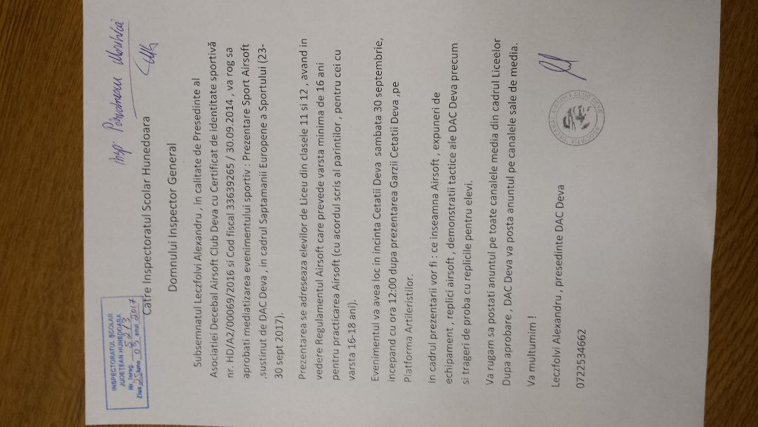 PERSOANA DE CONTACT: LECZFOLVI ALEXANDRU - telef.0722534662 - Președinte al Asociației Decebal Airsoft Club Deva.