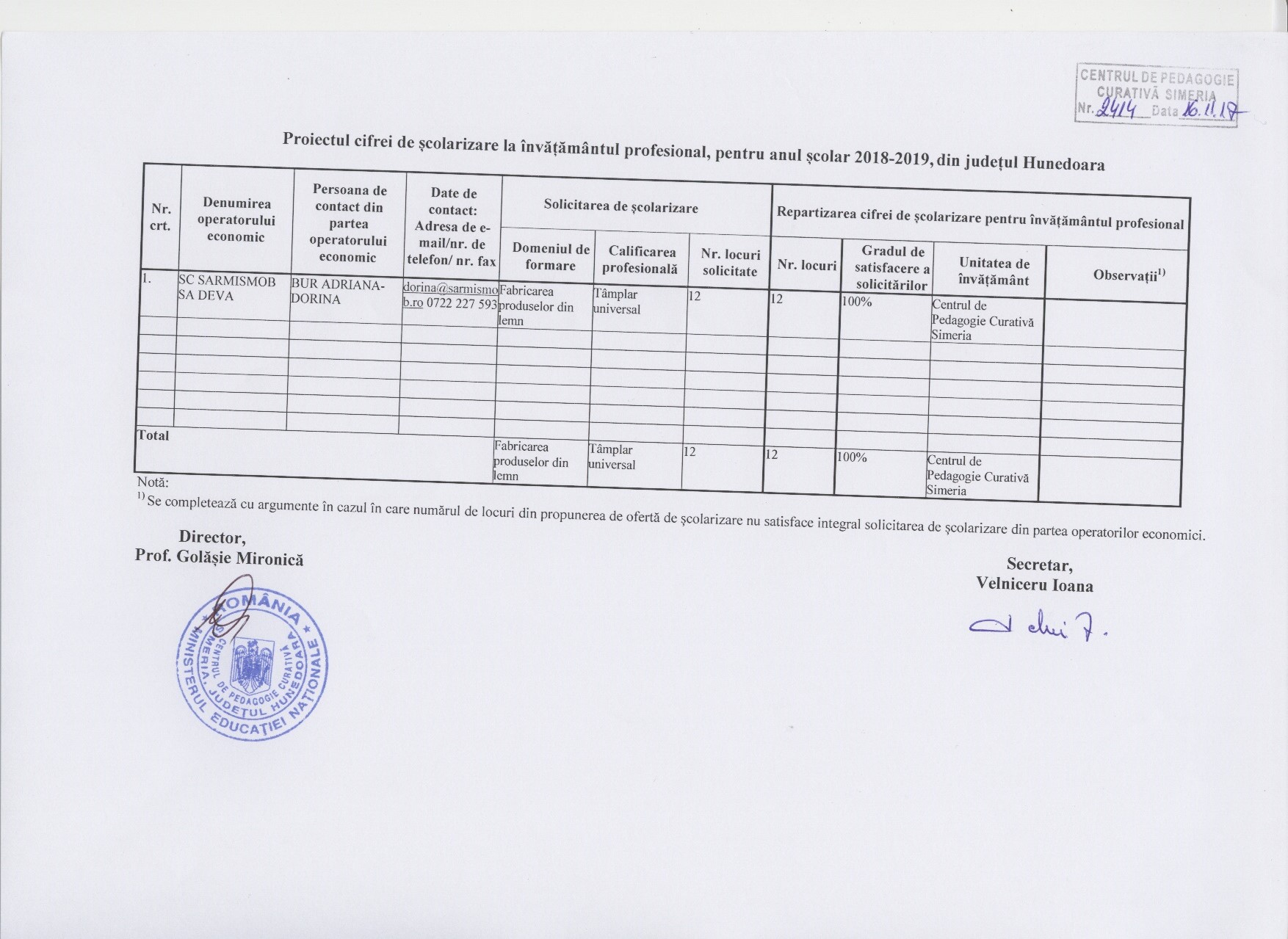 În vederea centralizării solicitărilor operatorilor economici cu privire la școlarizarea elevilor în învățământul profesional și dual, vă rugăm ca până la data de 17.11.2017, ora 16.00, să transmiteți toate solicitările operatorilor economici pentru învățământul profesional în format scanat, și machetele din atașament completate , în format letric la secretariatul ISJ Hunedoara și ca răspuns la acest topic în format electronic.