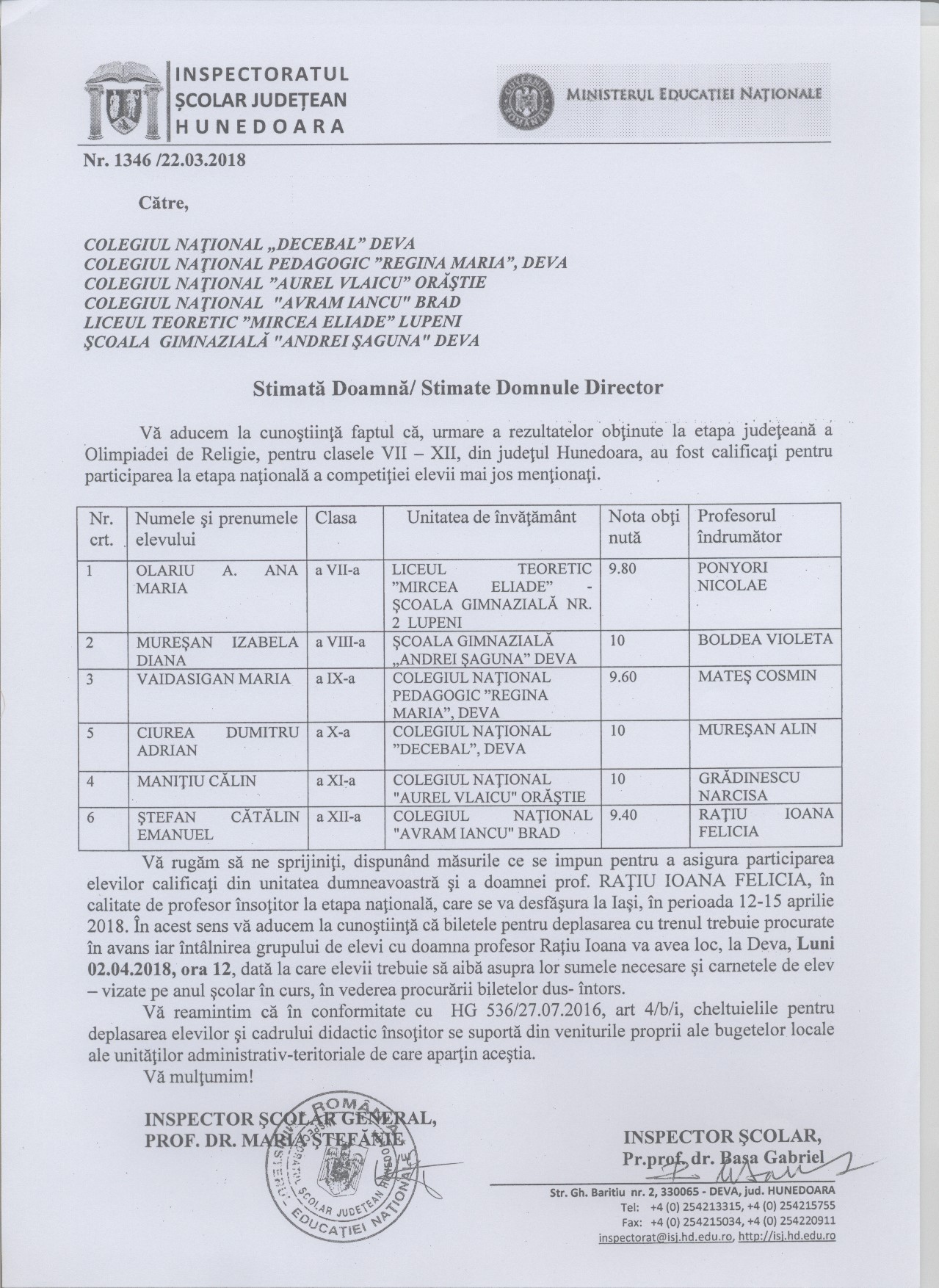 Stimați colegi, în fișierele atașate se gasesc scanate adresele care prevăd demersurile necesare în vederea decontării deplasării elevilor calificați la etapele naționale ale olimpiadelor și concursurilor școlare - la disciplina Religie și la concursul ”Cultură și spiritualitate românească” dar și precizările privind întâlnirile cu profesorii însoțitori.