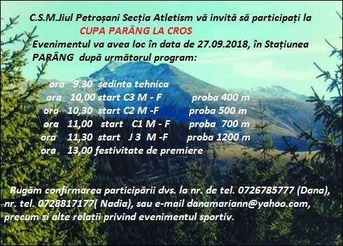 Asociația Județeană de Atletism în colaborare cu Inspectoratul Școlar Județean Hunedoara și Direcția Județeană de Sport și Tineret Hunedoara, precum și Clubul Municipal Petroșani, organizează pe data de 27.09.2018, CUPA PARÂNG LA CROS.