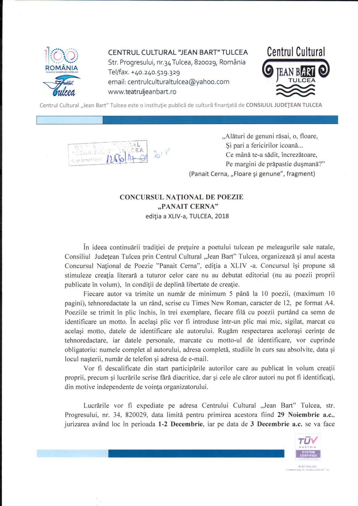 Centrul Cultural "Jean Bart" Tulcea vă invită la cea de-a XLIV-a ediție a Concursului Național de Poezie "Panait Cerna". Concursul se adresează autorilor care nu au debutat cu volum de poezie, iar în rândul populației școlare, cei vizați sunt, îndeosebi, elevii de liceu.