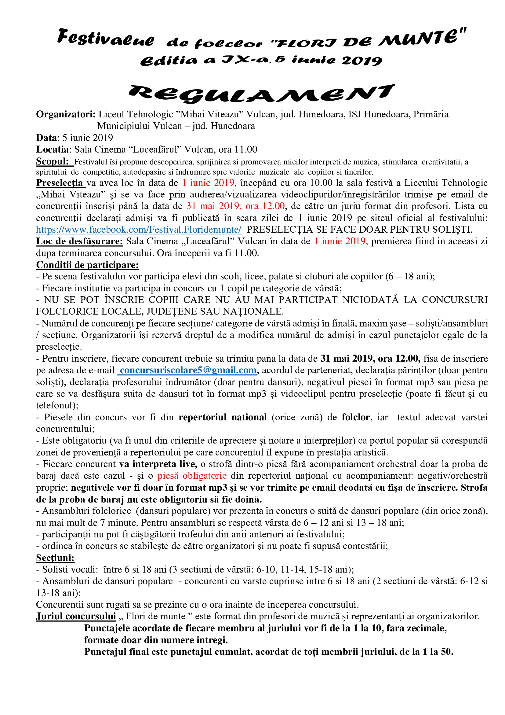 Vă invităm la ediția a IX-a a festivalului de folclor ”Flori de munte”, Vulcan, jud. Hunedoara, în data de 5 iunie 2019, ora 11.00, la Cinematograful Luceafărul din Municipiul Vulcan! Festivalul – concurs regional de muzică populară pentru copii este aprobat de MEN în Calendarul activităților educative regionale și interjudețene fără finanțare MEN, prin OMEN nr. 3016/09.01.2019, Anexa nr. 9, la poz. 1310.