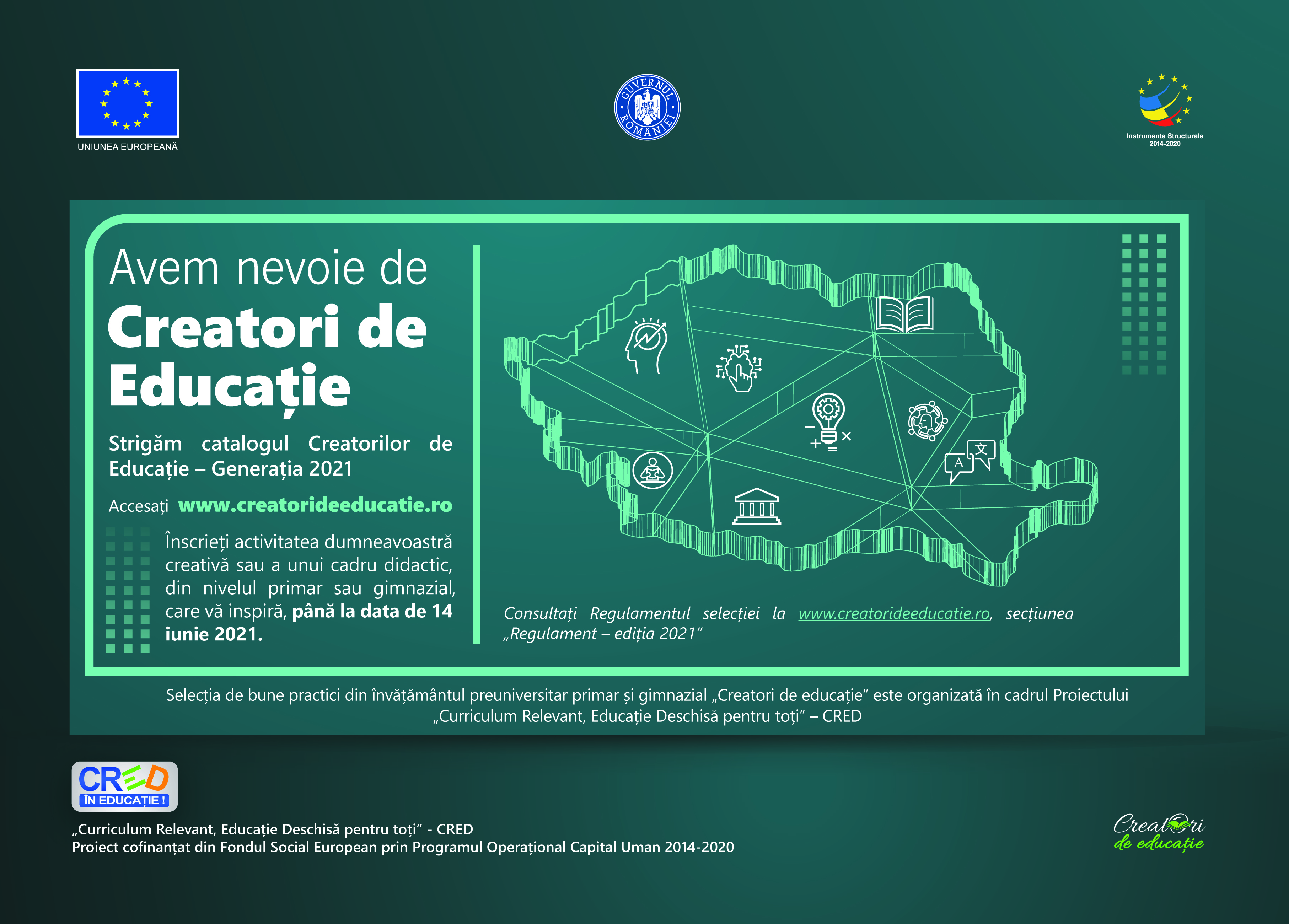 Cadrul didactic din învățământul preuniversitar primar și gimnazial își poate înscrie modelul de bună practică didactică, pentru obținerea titlului de „Creator de educație” pe adresa: https://www.creatorideeducatie.ro/