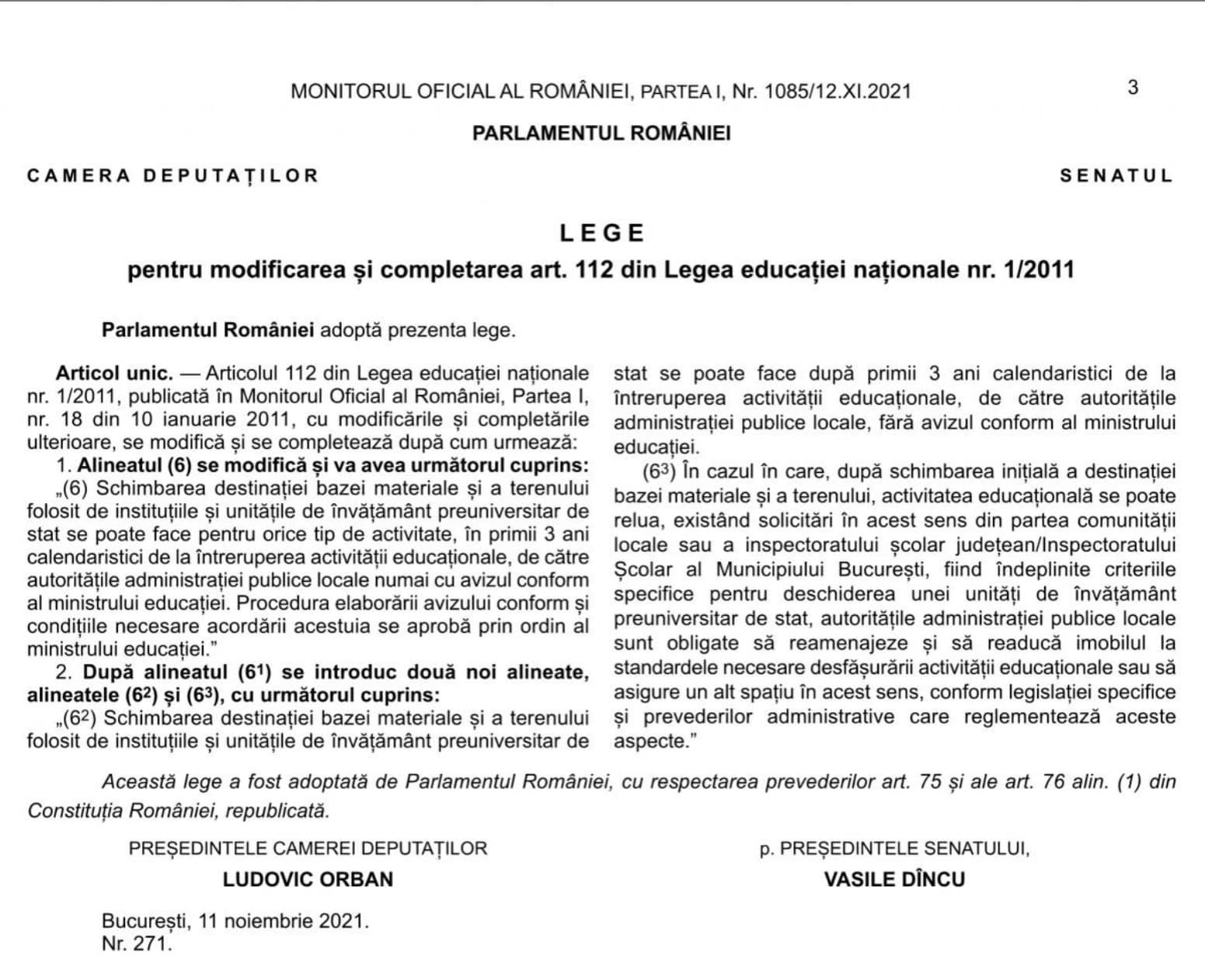 Legea nr. 271/2021 pentru completarea art. 112 din LEN