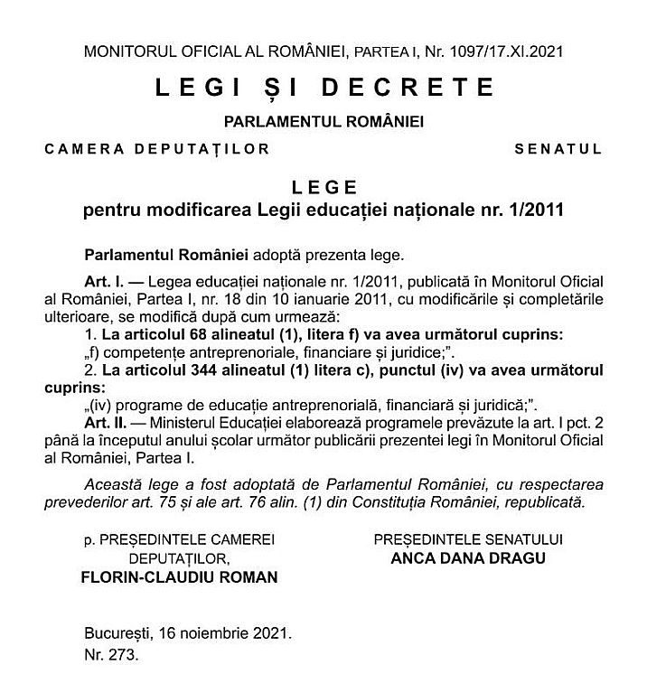 În Monitorul Oficial nr. 1092 din 17 nov. 2021 a fost publicată Legea nr. 273/2021 a educației antreprenoriale, financiare și juridice. De acum: