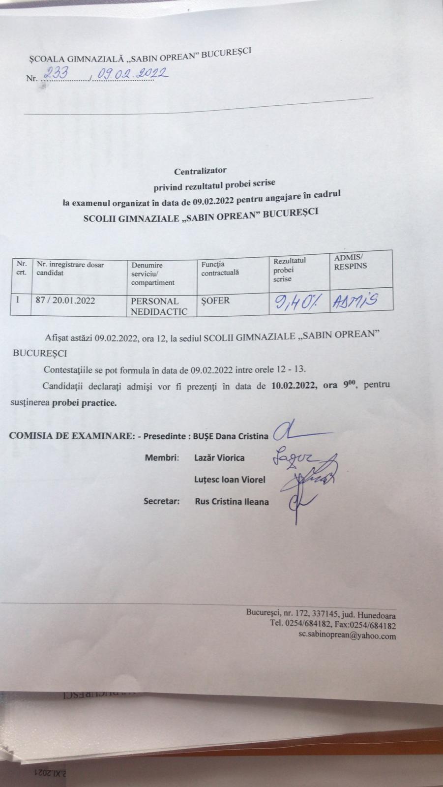 Re: Anunt concurs sofer Scoala Gimnaziala Sabin Oprean Bucuresci