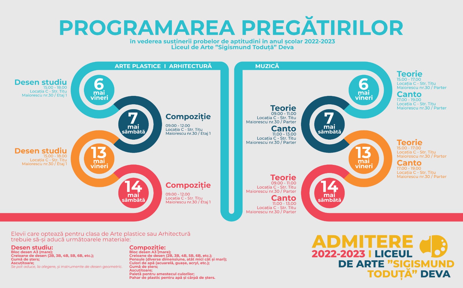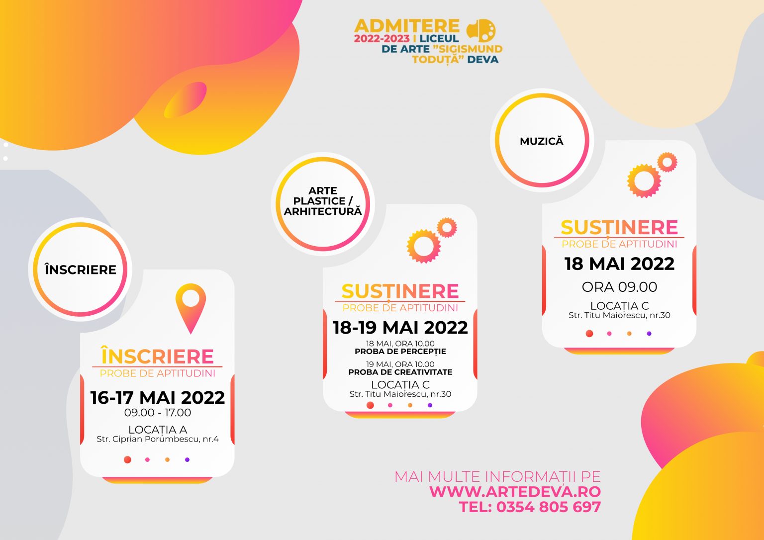 Graficul înscrierii, cerere-tip de înscriere, informații despre programarea pregătirilor candidaților în vederea susținerii probelor de aptitudini și multe alte informații specifice, găsiți accesând pagina web: http://artedeva.ro/wp/admitere-2022-2/
