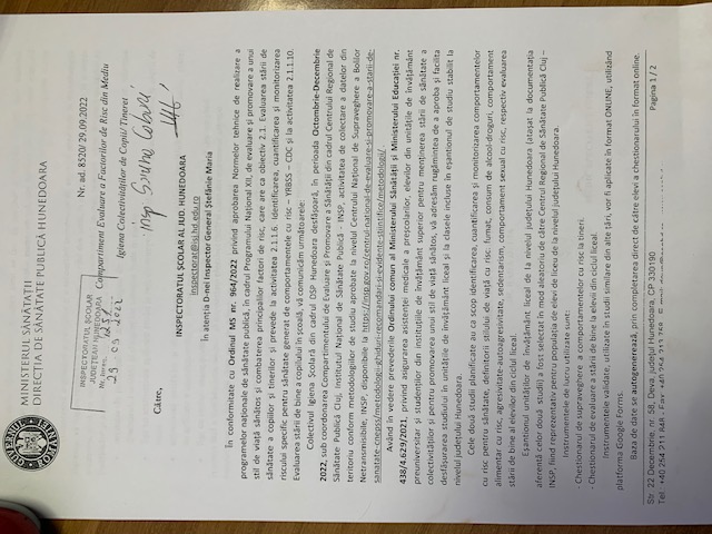 Ca răspuns la adresa Direcției de Sănătate Publică nr.ad. 8520/29.09.2022, în conformitate cu adresa IȘJ Hunedoara nr. 4251/29.09.2022 și a Ordinului MS nr. 964/2022, privind aprobarea Normelor tehnice de realizare a programelor naționale de sănătate publică, din cadrul Programului Național XII, de avaluare și promovare a unui stil de viață sănătos și combaterea principalilor factori de risc, vă informăm că în perioada Octombrie – Decembrie 2022, se vor desfășura două studii, cu scopul de a identifica, cuantifica și monitoriza comportamentele cu risc pentru sănătate, definitorii stilului de viață cu risc:fumat, consum de alcool- droguri, comportament alimentar cu risc, respectiv starea de avaluare stării de bine, al elevilor din ciclul liceal.